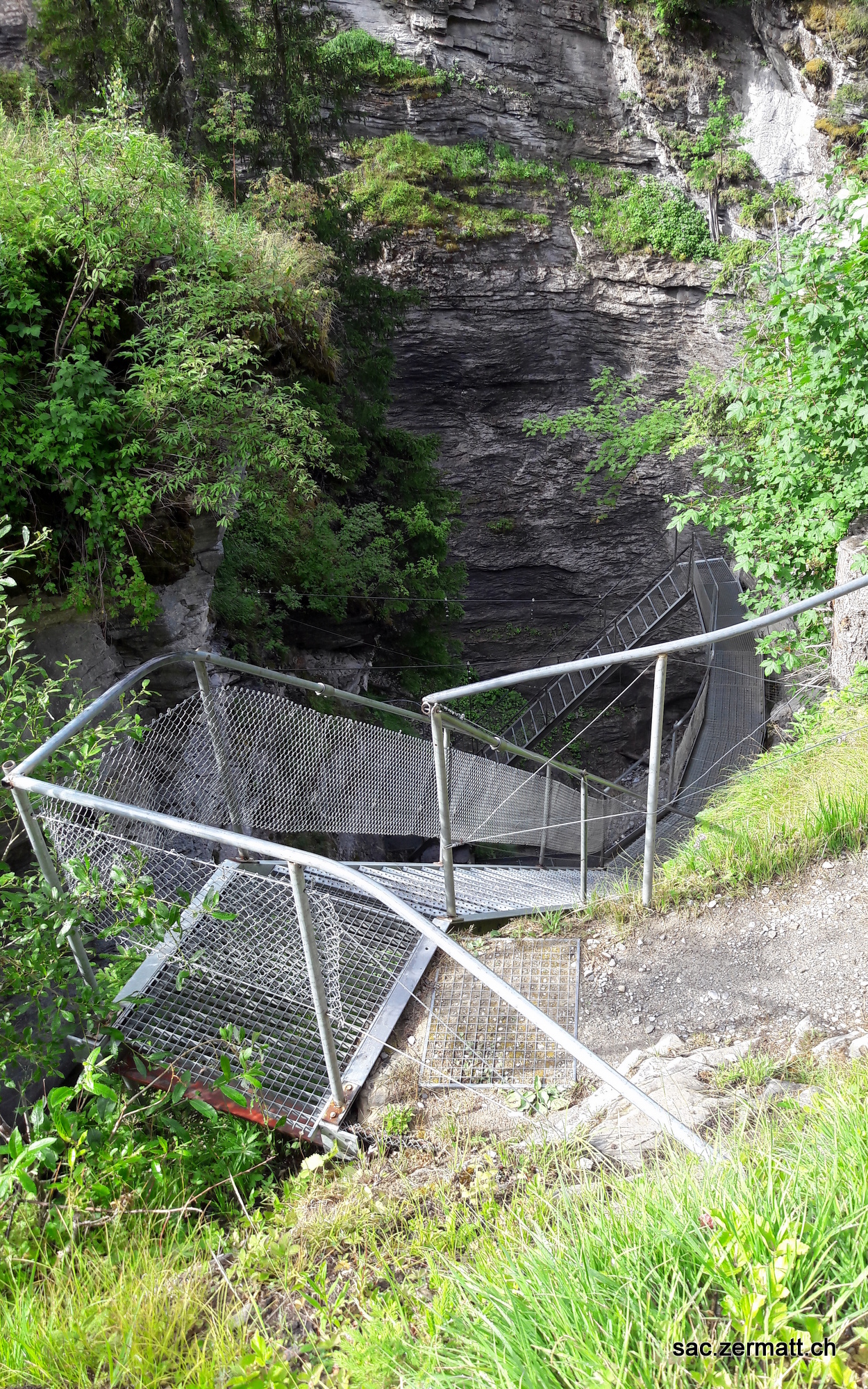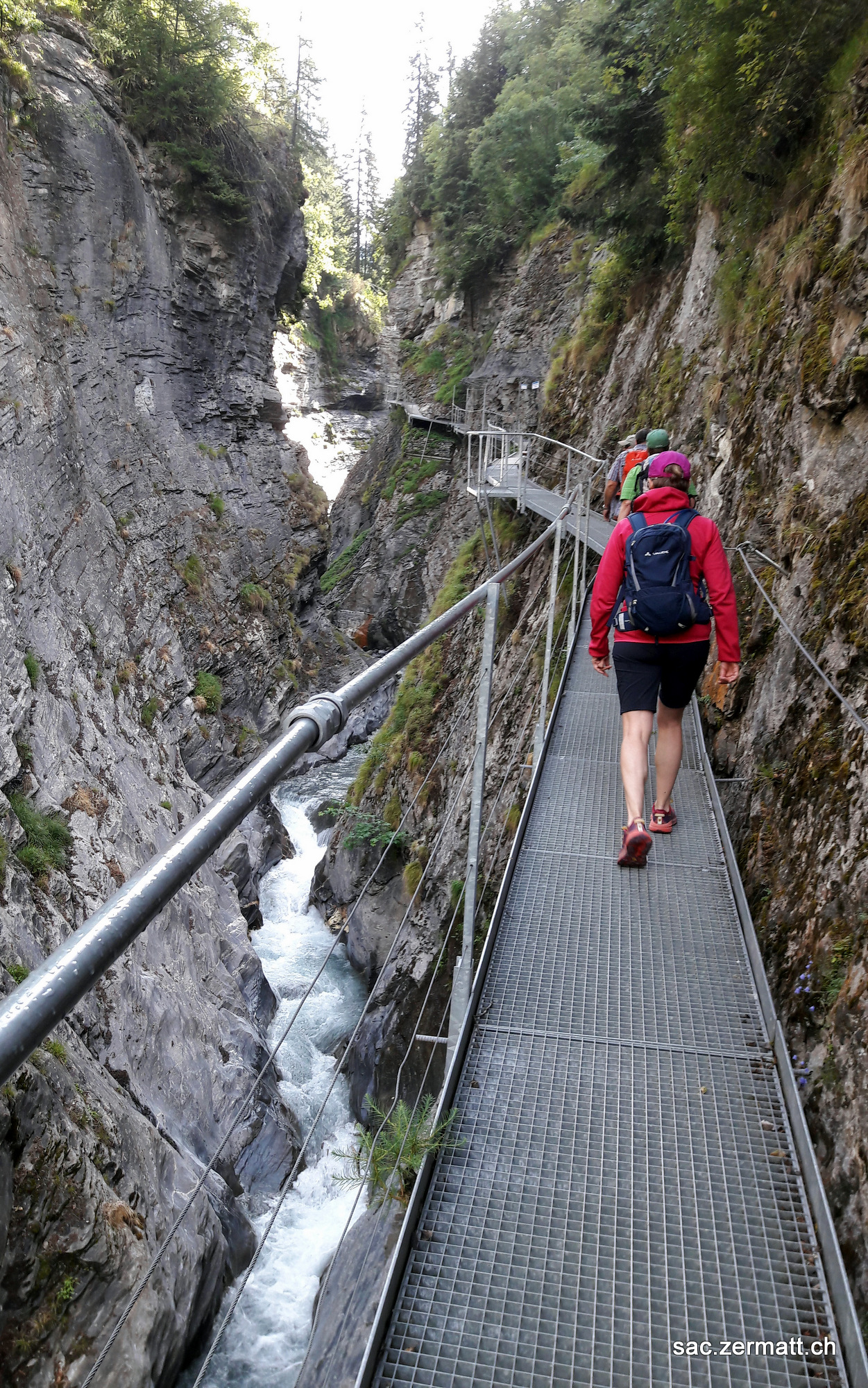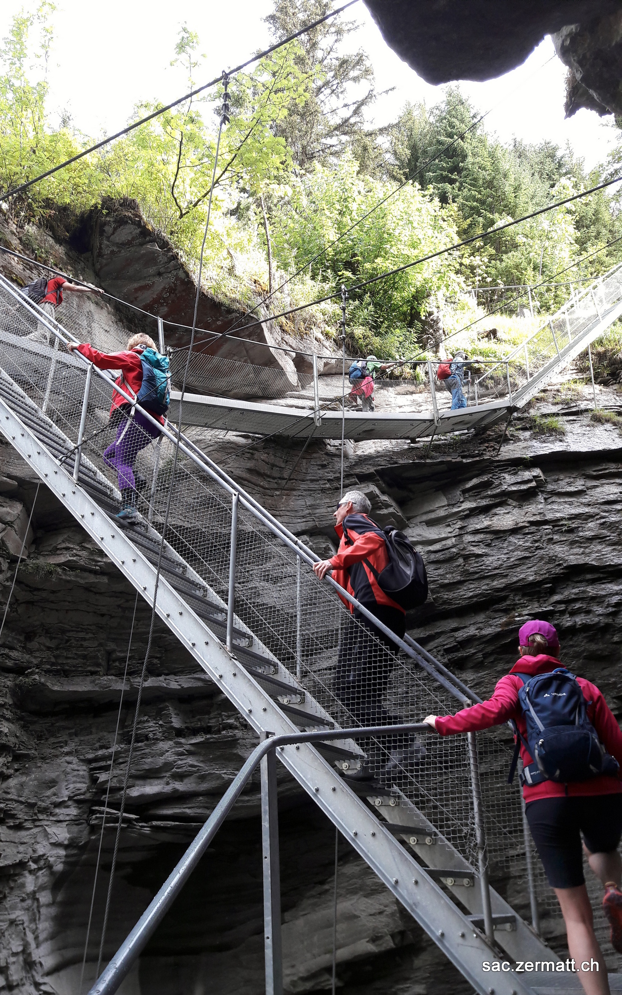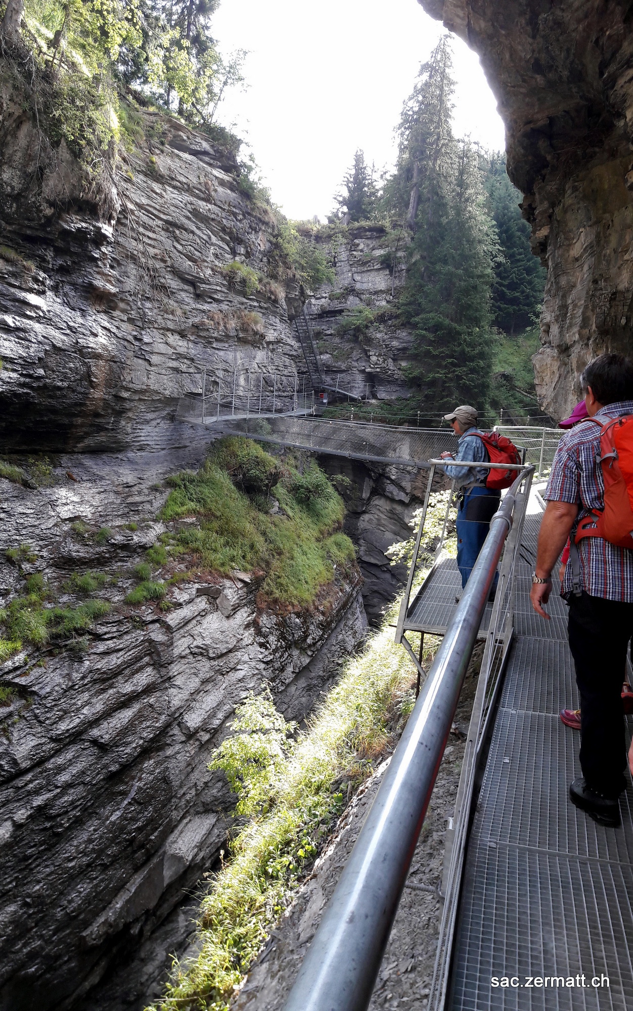 Schlucht über Eisenwege, welche an der Schlucht Wand montiert waren und über recht steile Eisentreppen bis zum Ende der Schlucht. Dort angekommen ging es gleich weiter über Waldwege und kurze