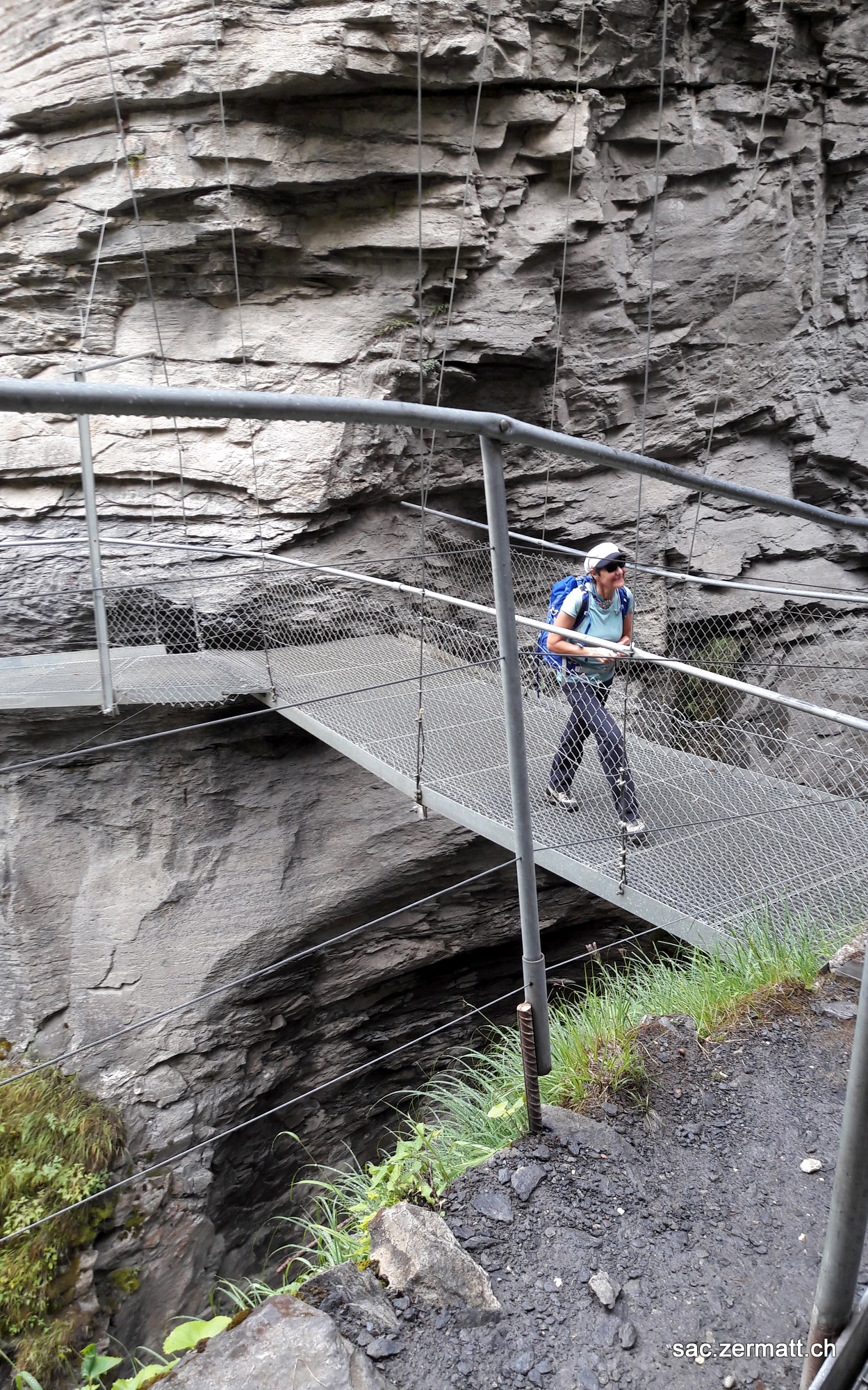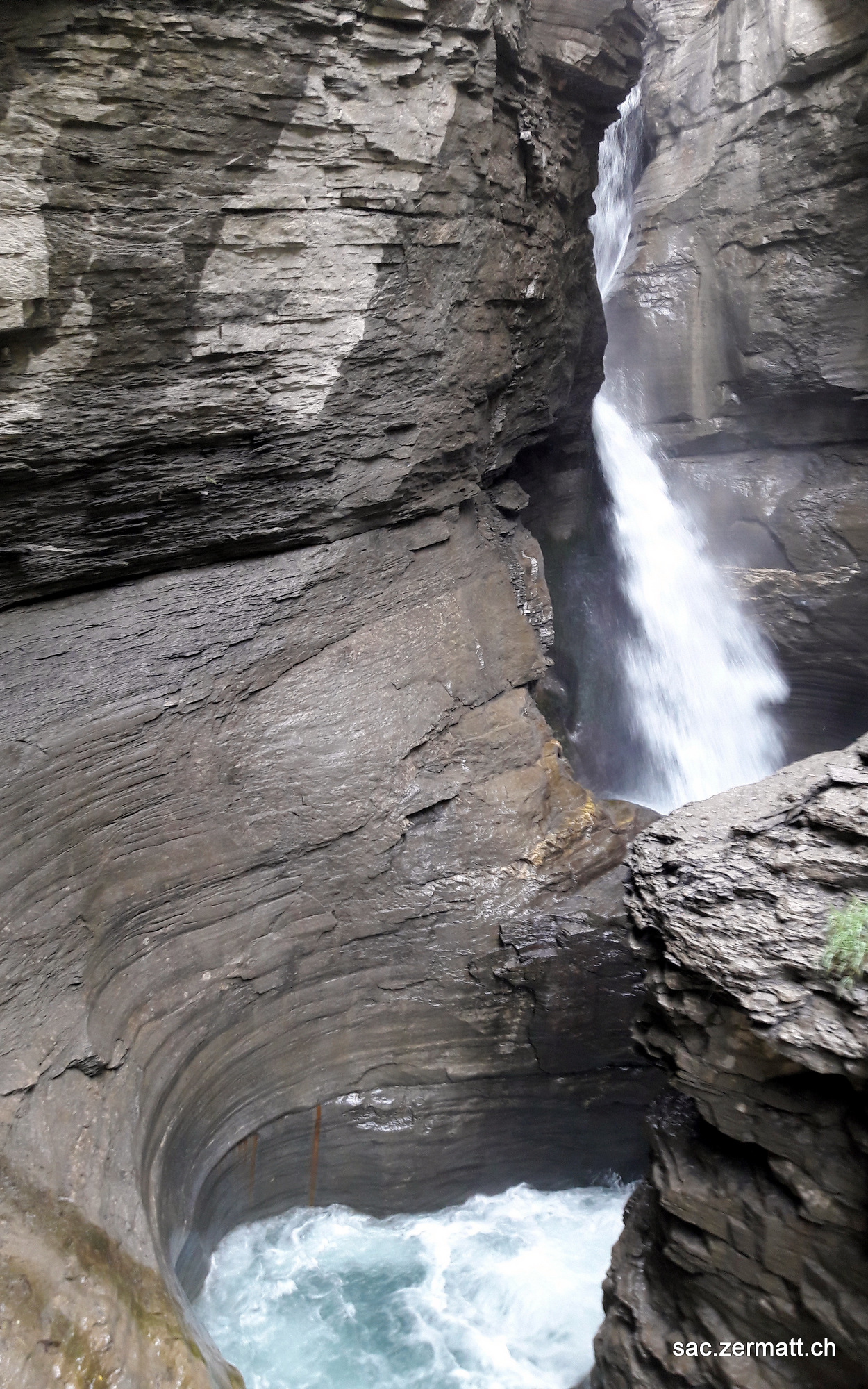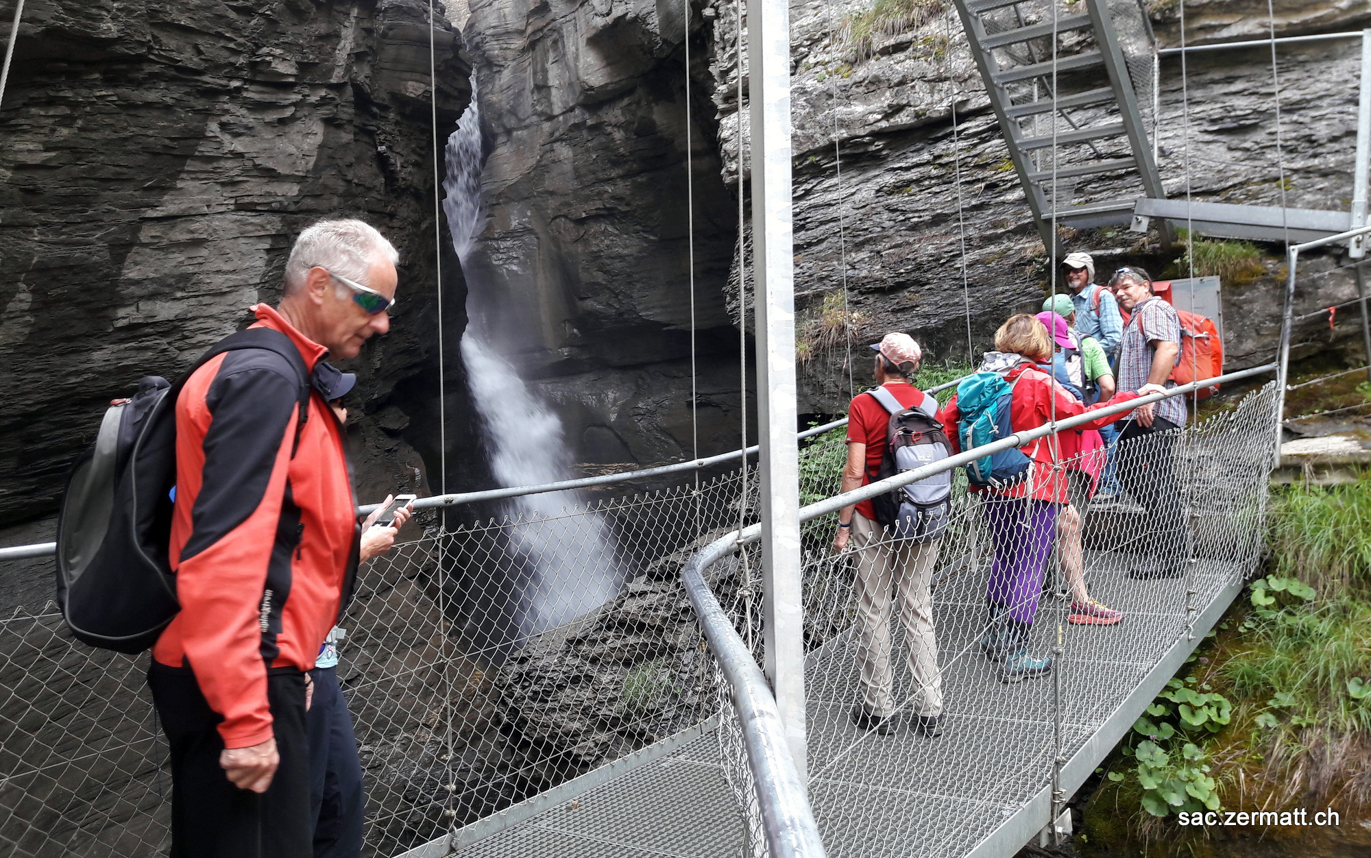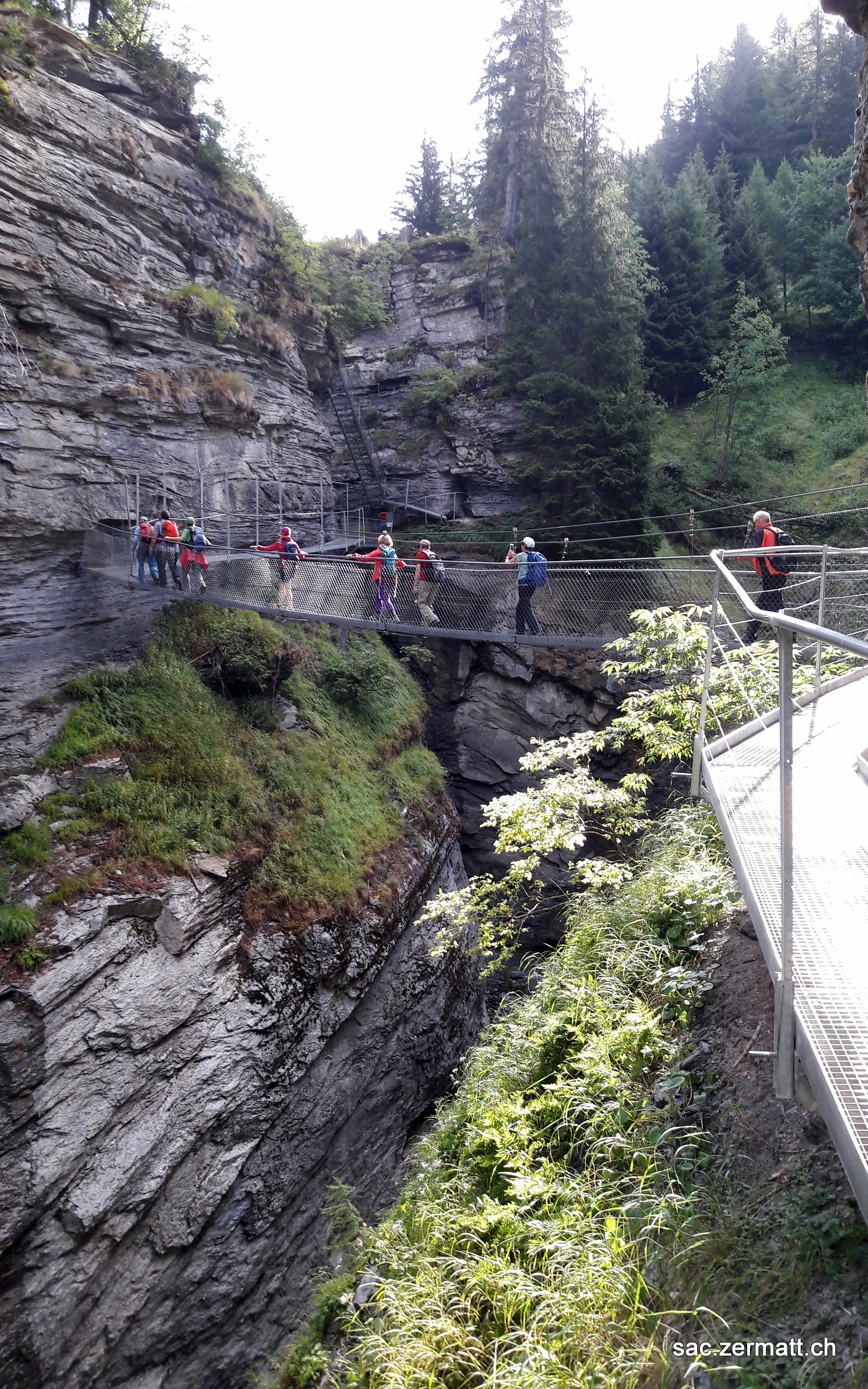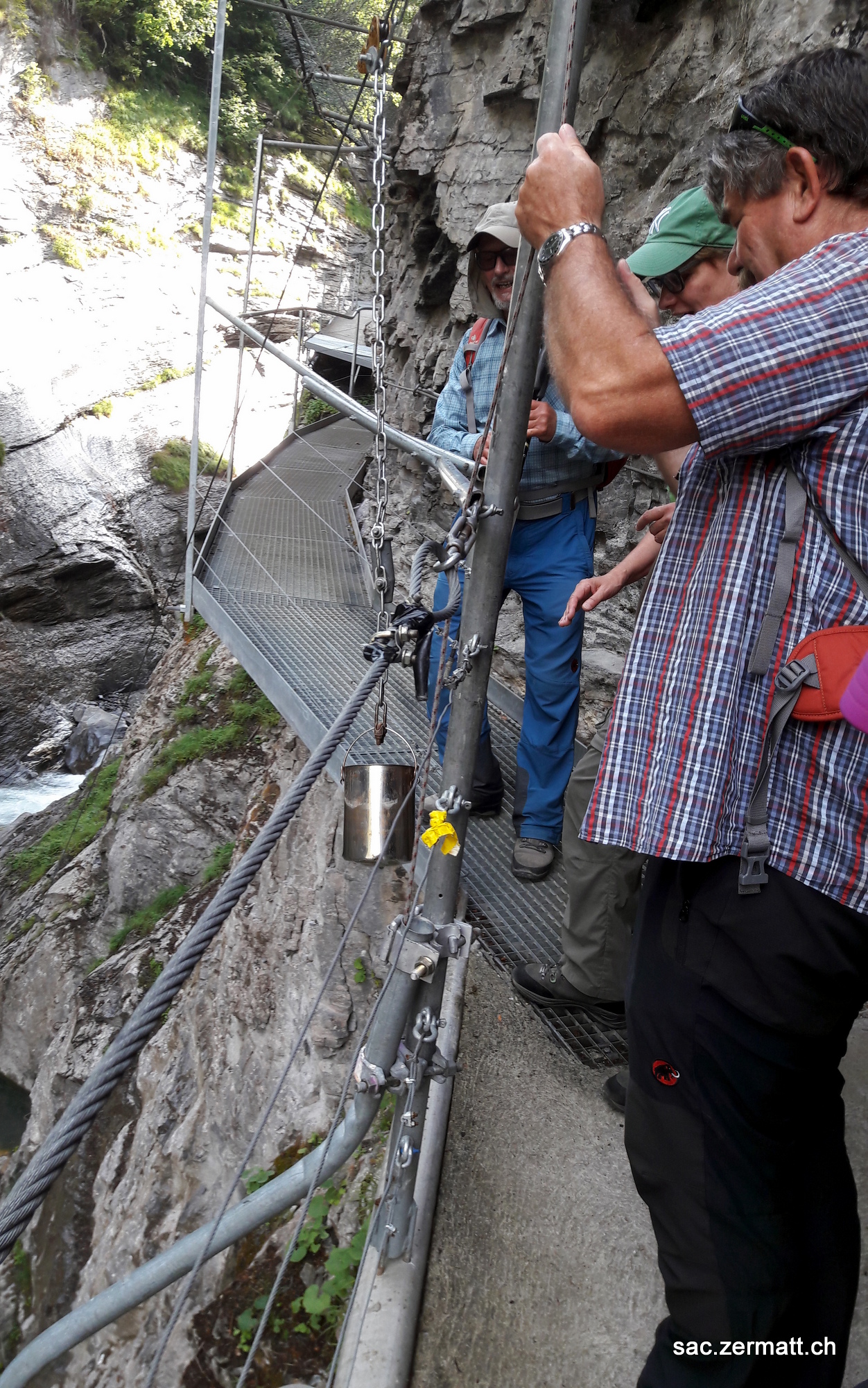heissen Wasserquellen, welcher Richtung Leukerbad braust. Per Flaschenzug konnten wir ein Eimerchen aus einer Quelle hochziehen um die Wassertemperatur zu spüren. Wir liefen im oberen Teil der