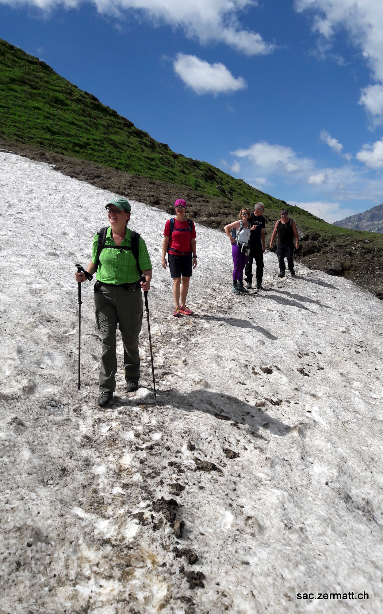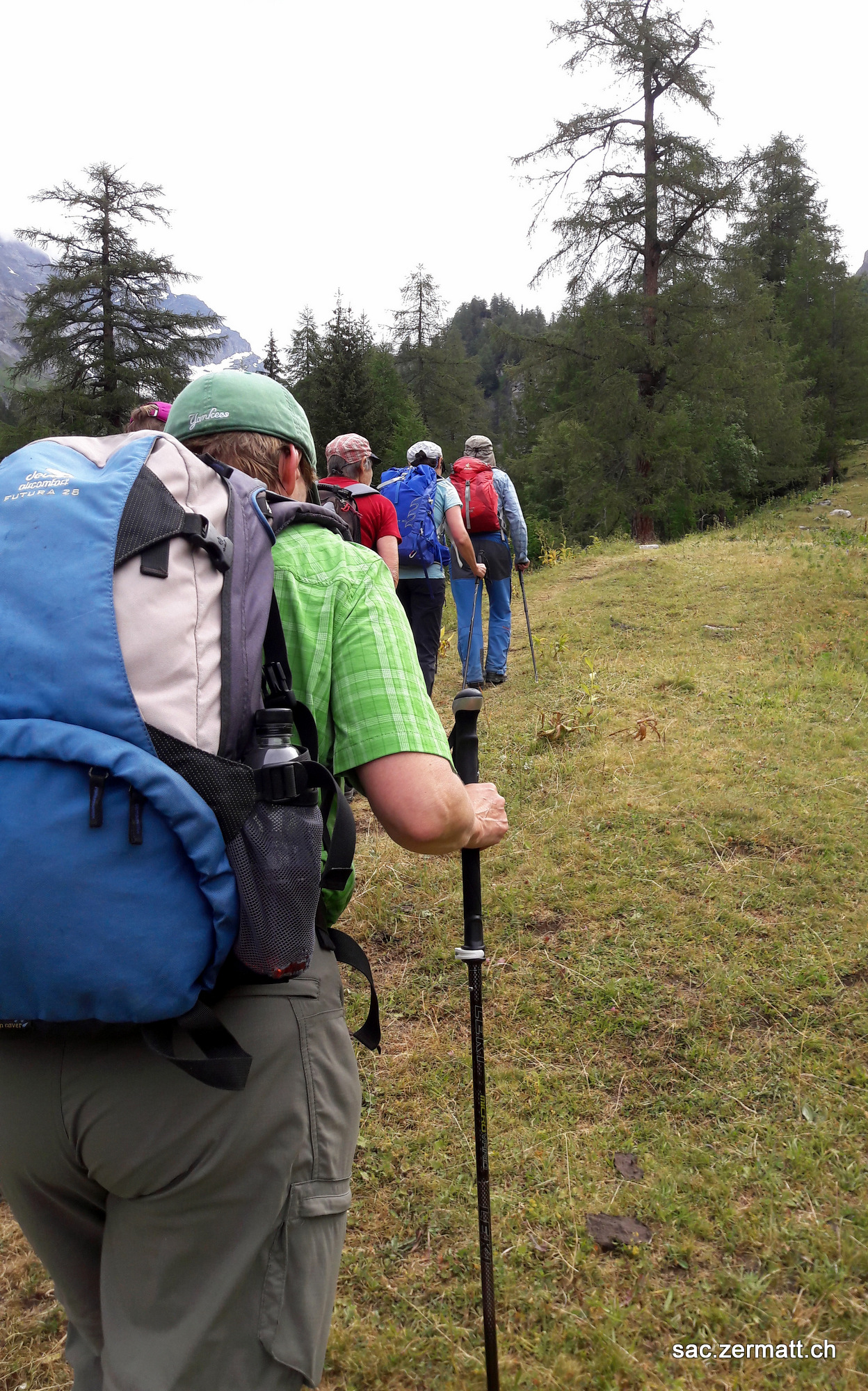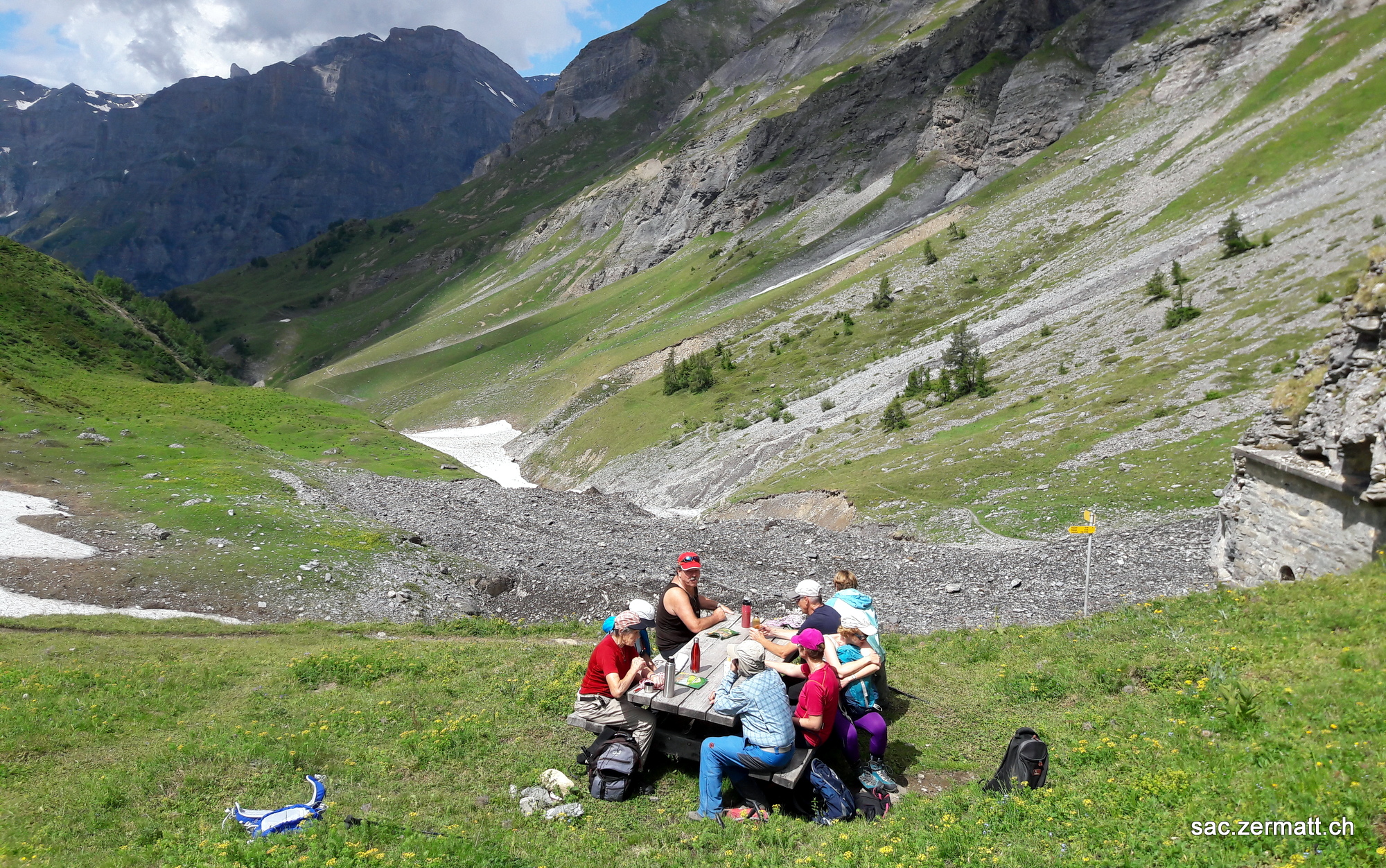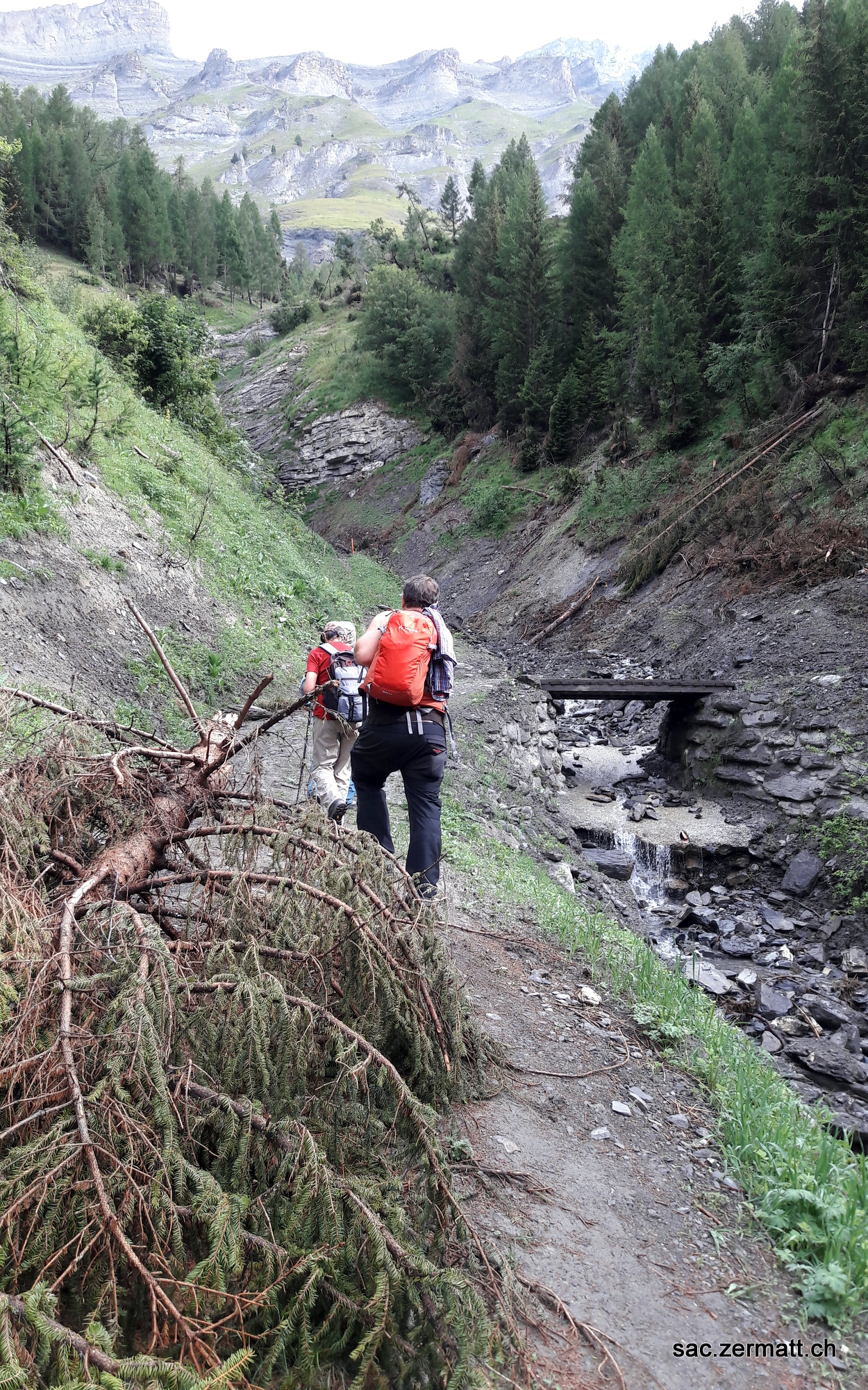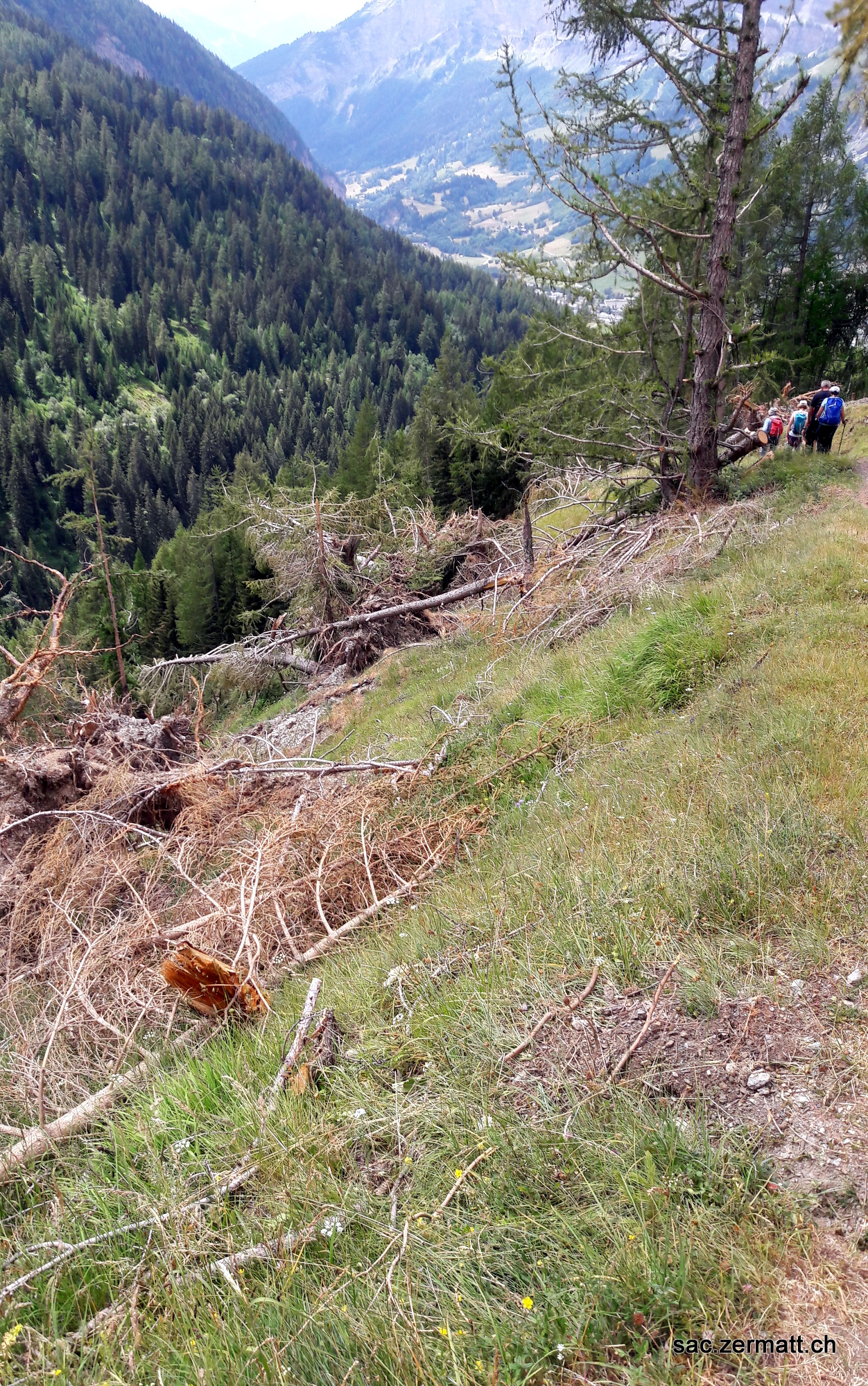 Nach 12.00 Uhr ging es dann abwärts, retour nach Leukerbad. Die ersten grauen Wolken waren zu sehen und Edi legte ein forsches Tempo vor, immer begleitet von Leonie die sich an seine Hacken heftete. Der Weg war gut, nicht allzu abschüssig, jedoch trafen wir alle paar Kurven auf Lawinenniedergänge mit Schnee vom Frühjahr. Dies erschwerte das lockere herunterlaufen, da es immer wieder hiess, Stöcke auspacken, Konzentration, Trittsicherheit auf dem schrägen rutschigen Untergrund. Aber Edi und Priska waren mit helfender Hand und guten Ratschlägen da und haben einigen, oder nur mir, super geholfen. Nachdem wir wieder Richtung Waldgrenze kamen wurden wir Zeugen der Waldzerstörung vom letzten Winter/ Frühjahr. Bäume über Bäume, entwurzelt, geknickt und schon teilweise zersägt, säumten unseren Weg. Trotz dem unschönen Anblick blieben wir immer wieder stehen um die Wucht der Zerstörung anzuschauen. Kurz vor Leukerbad, 13.30 Uhr, wurde dann in einem gemütlichen Restaurant eingekehrt. Schon bald nach der Bestellung, dankten wir Edi für seinen schnellen Schritt, da ein halbstündiger heftiger Regen niederkam. Wir sassen nun im Trockenen und konnten in aller Ruhe unser Panasch und kleines Mittagessen geniessen.