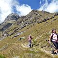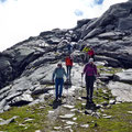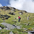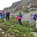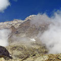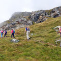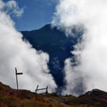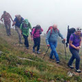 Eine Pause muss aber sein und so rasten wir kurz bei der Abzweigung zur Topalihütte bei ca. 2400m. Eine erste Vorahnung auf den späteren Ausblick zeigt sich imposant durch die Nebelwand. Etwas oberhalb bei Bodmen verzweigt der Weg und prompt schlagen wir den falschen ein. Der gewählte Weg verliert sich im Gras. Rucke-zucke werden die GPS-Karten konsultiert und schon bald finden wir den richtigen Weg weiter oben wieder. Ergebnis: erfreuliche 20HM Mehraufstieg.