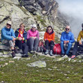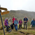 Noch mal einen Stock höher werden wir von Schafen belagert, welche sogleich von Desirée und Edi im richtigen Benehmen geschult werden. Philipp nimmt das etwas lockerer und schliesst Freundschaft mit einem Herdenmitglied, welches treu ergeben noch länger am Hosenbein von Philipp kleben bleibt. Auch dieses Hindernis wird erfolgreich überbrückt und schon stehen wir vor einem gewaltigen Gipfelkreuz – leider immer noch im Nebel. Zeit für Verpflegung und das farbige Gruppenbild!