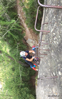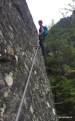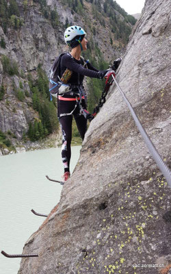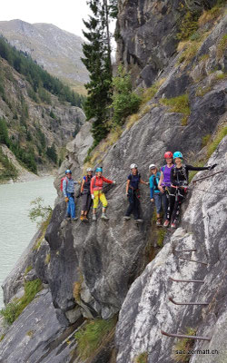 Meines Erachtens lohnt es sich fast nicht, für dieses kurze Gleiten, extra Seil und Bremse mitzunehmen. Nach etwa 3 Stunden, einige Treppenstufen runter, Überquerung der Staumauer und viele Treppenstufen hoch, erreichten wir wieder unsere Autos, wo wir unser verdientes Picknick einnahmen. Den Abschiedstrunk genehmigten wir uns wieder im Restaurant in Blatten. Kaum drinnen, fing es richtig an zu „schiffen“. Wir hatten Glück!