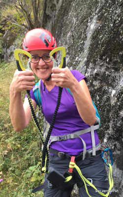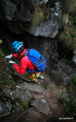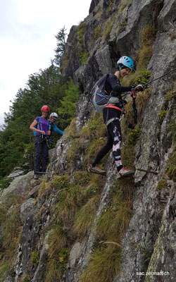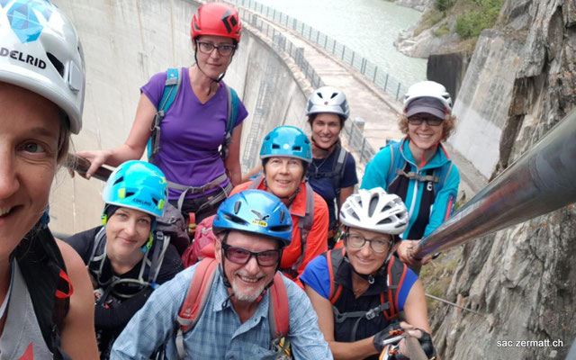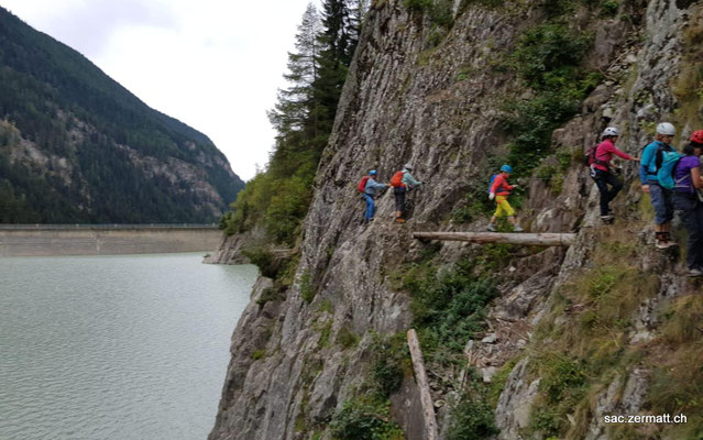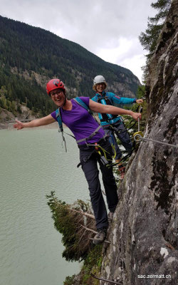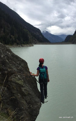 Nachdem wir uns gestärkt hatten, fuhren wir mit 2 Autos los, Richtung Gebidum Stausee. Nach kurzem Besuch einer, uns bisher unbekannten Deponie, erreichten wir schliesslich den Parkplatz beim Anfang des Klettersteiges. Der Himmel war bedeckt und so hofften wir, dass wir dem Regen dennoch entgehen können. Andrea testete kurz, ob wir alle unsere „Gstältli“, Klettersteigsets und Helme richtig montiert haben, dann legten wir los.