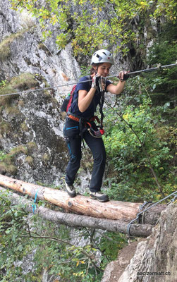 Nach einem kurzen Wegstück war eine senkrechte Wand zu bewältigen. Danach folgten viele ausgesetzte Stellen, direkt über dem Wasser, jeweils mit toller Aussicht, dazwischen auch erholsame Wegstücke. Ein wackliges Seil und ebenso wacklige Baumstämme mussten überquert werden. Fast am Schluss kamen wir zu einer kurzen Tyrollienne, welche wir jedoch, mangels entsprechender Ausrüstung, umgingen.