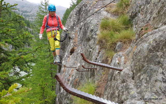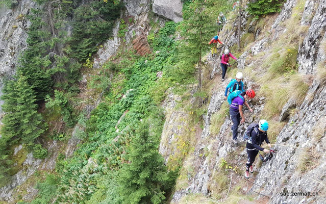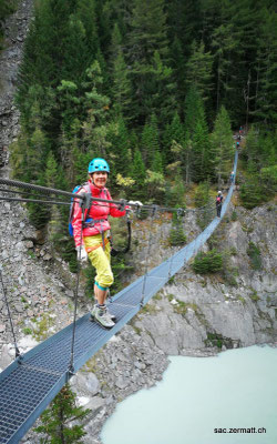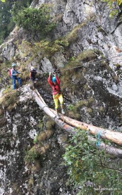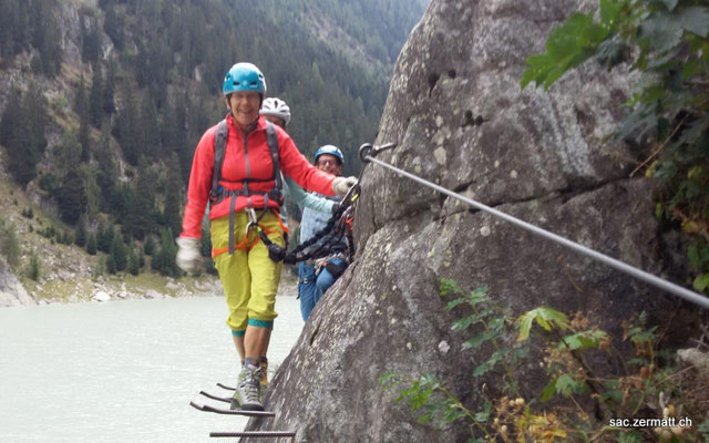Taleinwärts, in stetem Auf und Ab, immer dem See entlang, mit eisernen Griffen und Tritten, klickten wir uns am Seil weiter. Dazwischen führten auch kurze Fusswege weiter. An einem lauschigen Plätzchen machten wir eine Trinkpause, während einige Tropfen vom Himmel fielen. Dennoch erreichten wir trocken, etwas später die Hängebrücke zuhinterst an See. Nur 3 Personen dürfen gleichzeitig über die Brücke laufen. Wir gelangten aber alle problemlos ans andere Ufer.