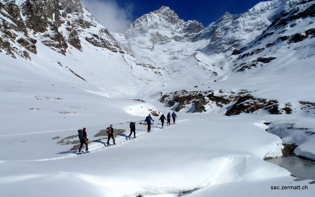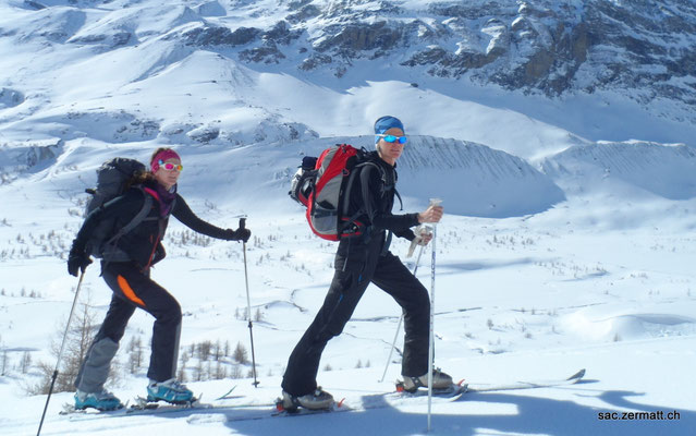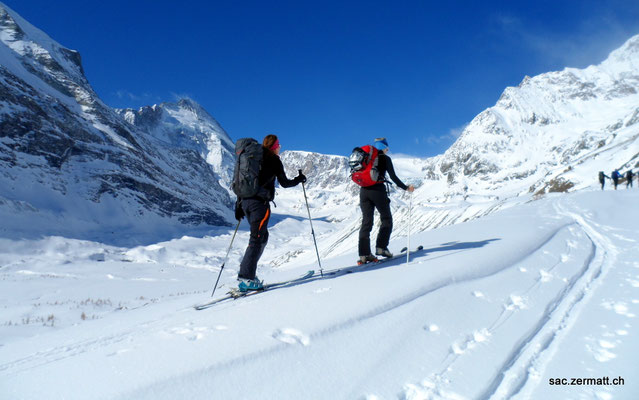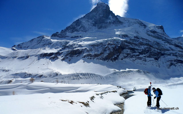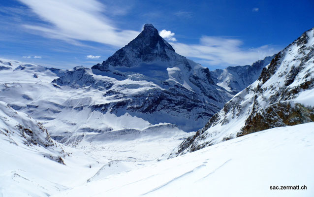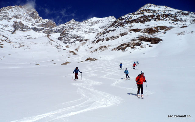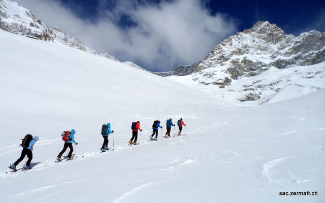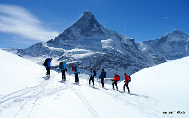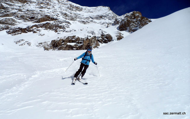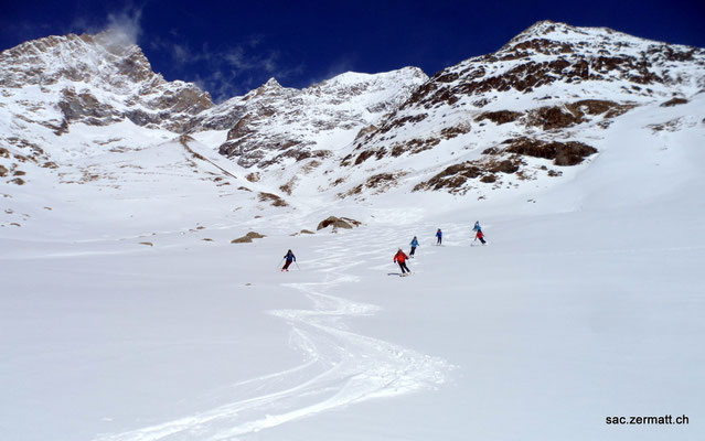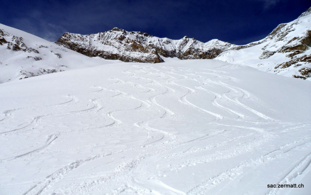 Nach einer kurzen Gondelfahrt auf Schwarzsee fuhren wir in Richtung Staffelalp hinunter wo die Felle montiert wurden und die Temperatur es zuliess, die dickeren Jacken im Rucksack zu verstauen. Der Aufstieg verlief ohne Probleme und bei guten Schneeverhältnissen. Oben angekommen genossen wir die atemberaubende Aussicht u.a. auf die Matterhorn Nordwand, Dent Herens und natürlich direkt vor uns das Obergabelhorn. Auch die Lawinensituation konnte gut beurteilt werden, so dass wir eine sichere Tour durchführen konnten.