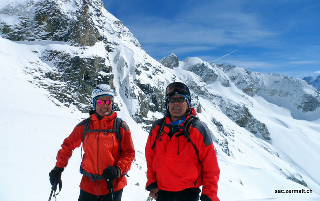 Die Schneeverhältnisse bei der Abfahrt waren besser als zuerst erwartet und so konnten wir ein paar schöne Spuren in den unbefahrenen Hängen hinterlassen. Für die perfekten Fotos war Urs zuständig J. Zurück in Richtung Zermatt konnten wir noch gemeinsam und natürlich Corona-Konform bei einem Glas Weisswein auf die gelungene Tour anstossen.