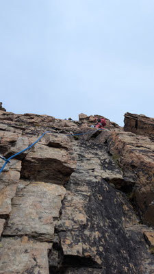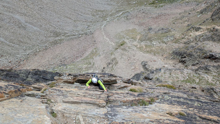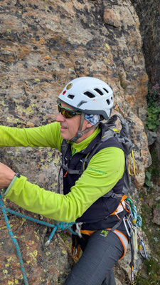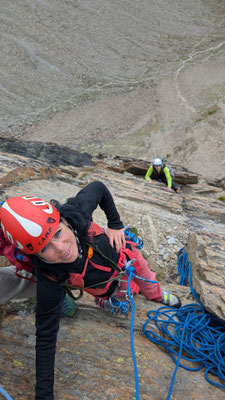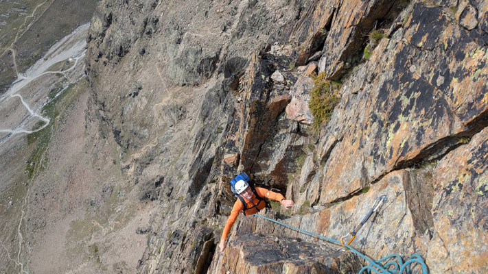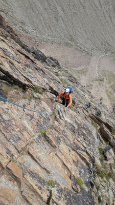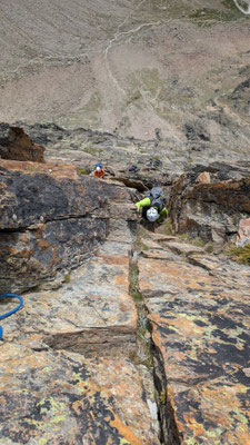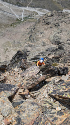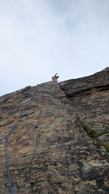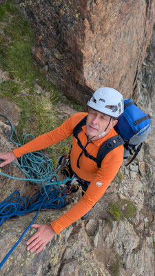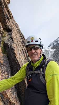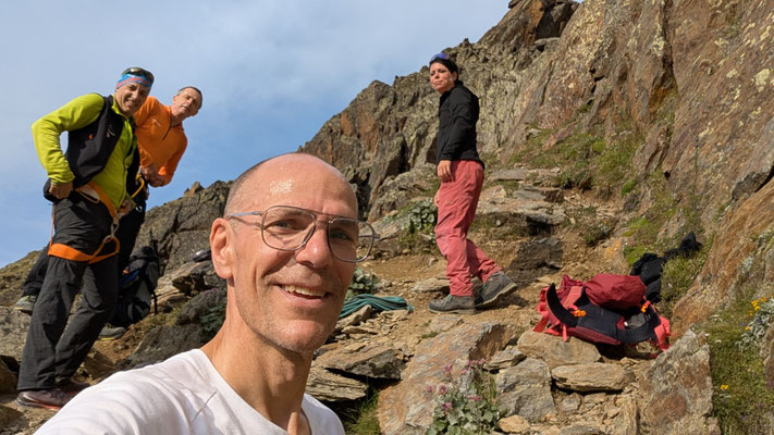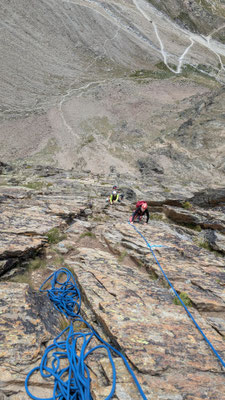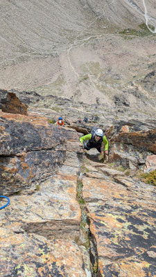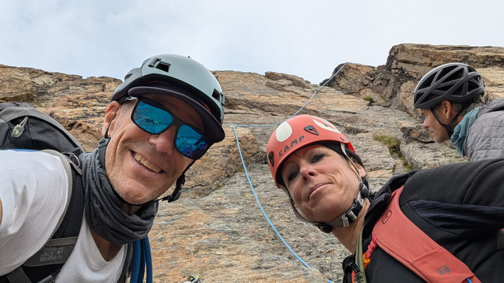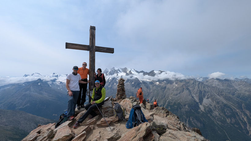 Nach einem angenehmen Zustieg, den Fernando wegen seinen Fussproblemen mit dem Fahrrad zurückgelegt hat, stehen wir also am Einstieg der Kletterroute Alpendurst. Wir sind gut betreut, mit zwei Tourenleitern und SAC-Präsidenten, wahrlich ein Privileg! Der Aufstieg vergeht wie im Fluge. Eine schöne, regelmässige Kletterei im 4. Schwierigkeitsgrat, über 13 oder 14 Seillängen (scheinbar sind sich da die Saasinj nicht einig) … und immer diese schöne Aussicht um uns herum! Es hat zwar mehrere andere Seilschaften auf der Route (auch da hat Marco gut entschieden, diese Tour nicht am Wochenende zu machen), aber alle kommen in etwa gleich schnell voran, so dass es wenig Wartezeiten gibt. Und diese lassen sich angenehm überbrücken bei Gesprächen mit den internationalen Bergkameraden.