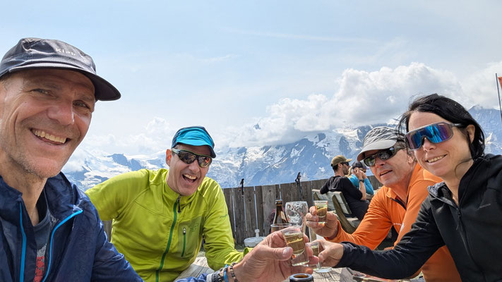 Eine gemütliche Gipfelrast, ein durch Diskussionen um Gott und die Welt kurzweiliger Abstieg … und schon sitzen wir auf der Terrasse der Weissmieshütte. Ein schöner Ausklang dieser Klettertour!