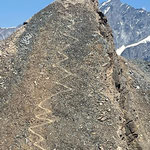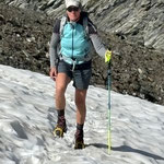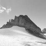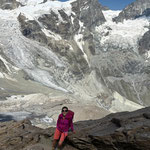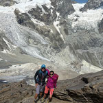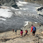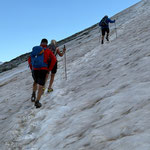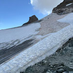 Auf der grasigen Hochebene „Triftchrumma“, weideten Schafe. Langsam aber kontinuierlich stiegen die Temperaturen an diesem heissen Sommertag. Daher wurde Anja's guten Rat, unsere Trinkflaschen mit Wasser aus dem Bach nachzufüllen, sehr geschätzt. Über Schutt, Geröll und Felsplatten ging es nun hinauf zum Furggji. Nach Anziehen der Steigeisen oder „Gräppini“ ging es über den Hohliechtgletscher der aper war. In der Normalline im kurzen Abschnitt, wo der Gletscher ein kritisches Gefälle aufweist, zwang Blankeis, die zwei Gruppen vor uns zum Abbruch.