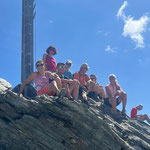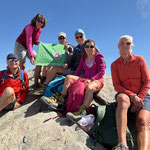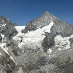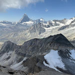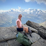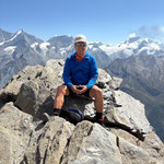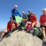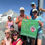 Durch Anja's anpassen der Route meisterten wir diese Schlüsselstelle ohne Probleme. Im Zickzack ging es nun ohne Steigeisen hinauf zum Mettelhorn 3‘406 m. Auf das Erreichen des Gipfels (49. Gipfel der diesjährigen Ziels), wurde mit einem feinen Genepy angestossen (Danke Anja). Nach dem Gipfelfoto mit unser SAC Fahne, genossen wir ausgiebig die Traumaussicht bei warmen Temperaturen. Das 360 Grad Panorama, auf nahezu alle Walliser Viertausender, bis zu den Berner Viertausender, war wunderschön.