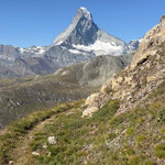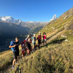Abgestimmt auf die Ankunft des ersten Zugs, trafen wir uns um 6:15 Uhr, am Bahnhof Zermatt. Bei angenehmer Temperatur, noch im Schatten, wanderten wir zum Ausstieg des Klettersteigs. Dort machten wir eine Trinkpause und genossen die ersten morgendlichen Sonnenstrahlen auf unser Haut.