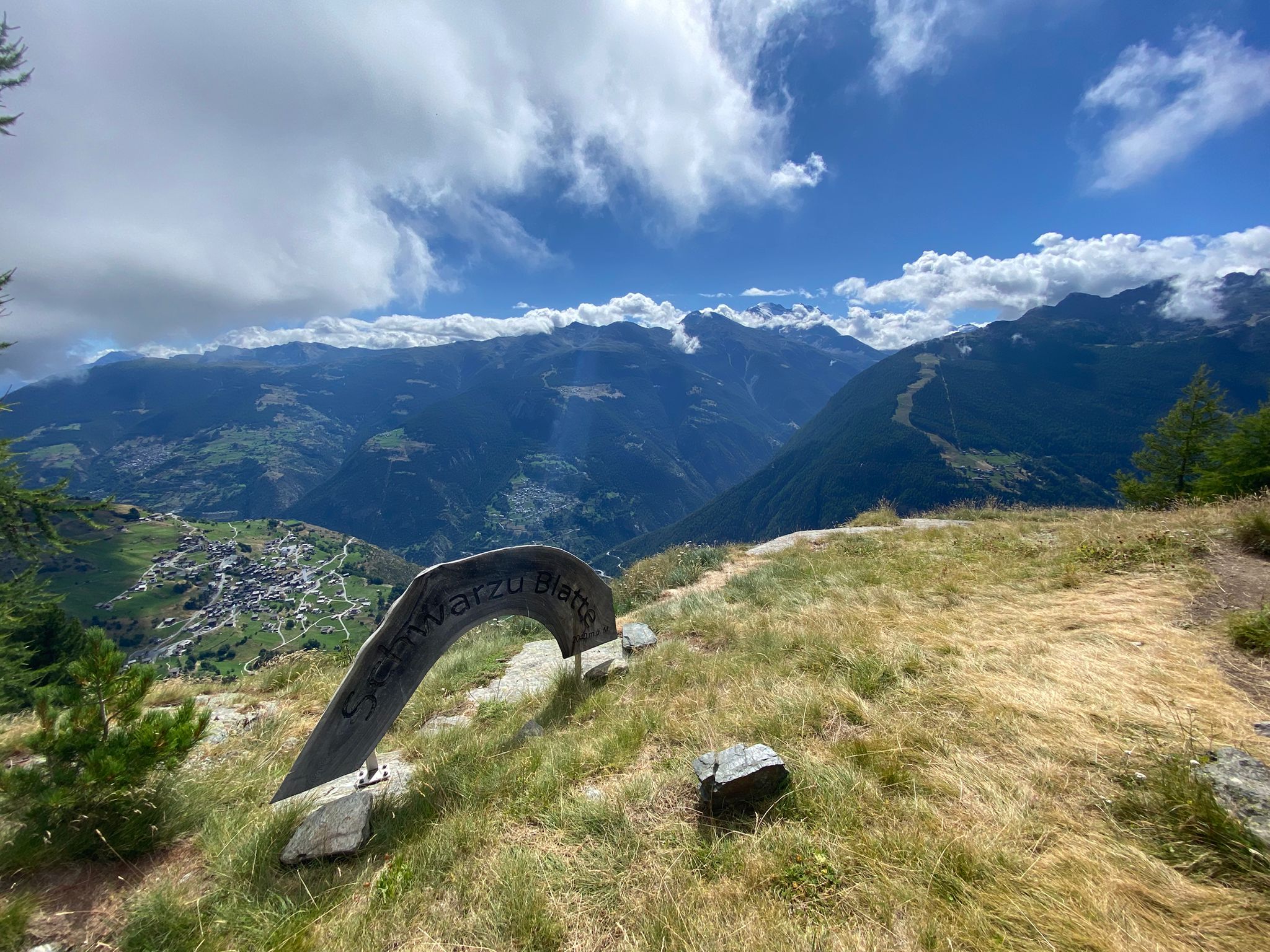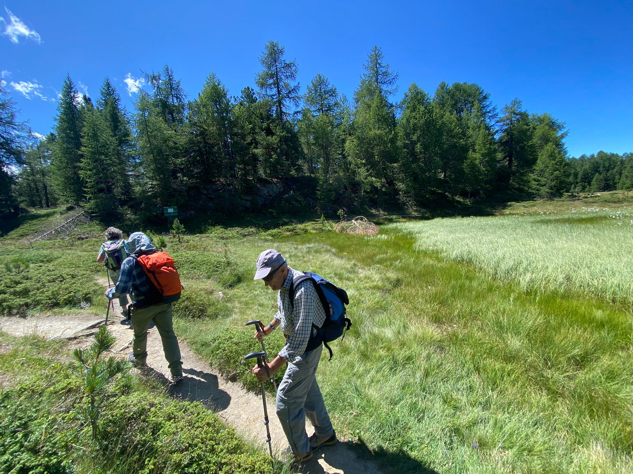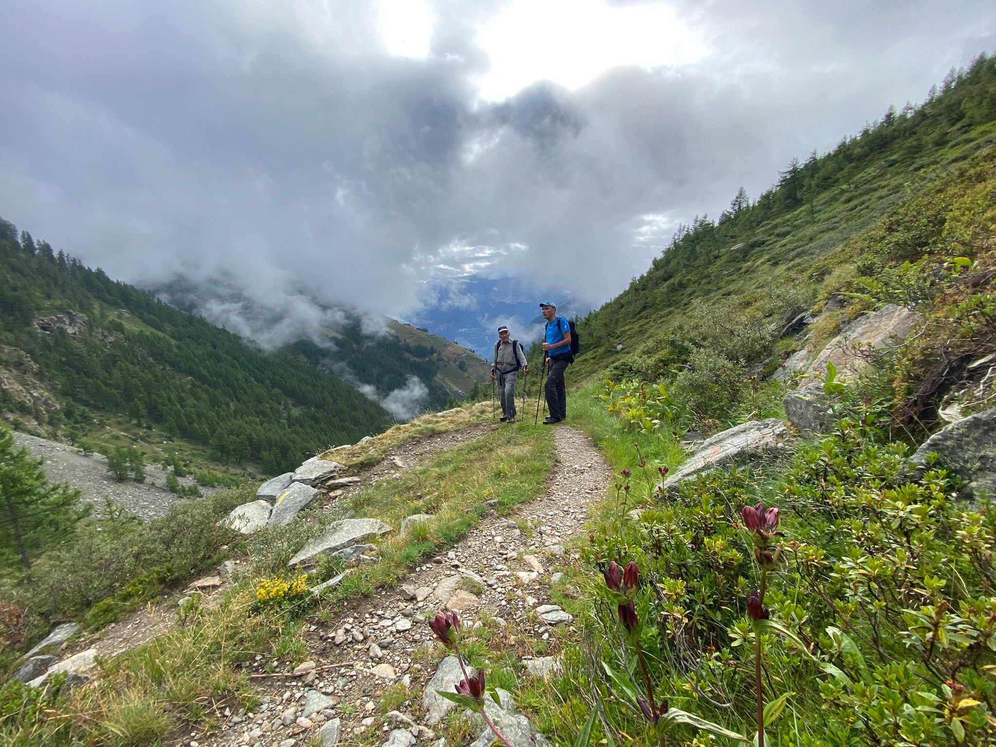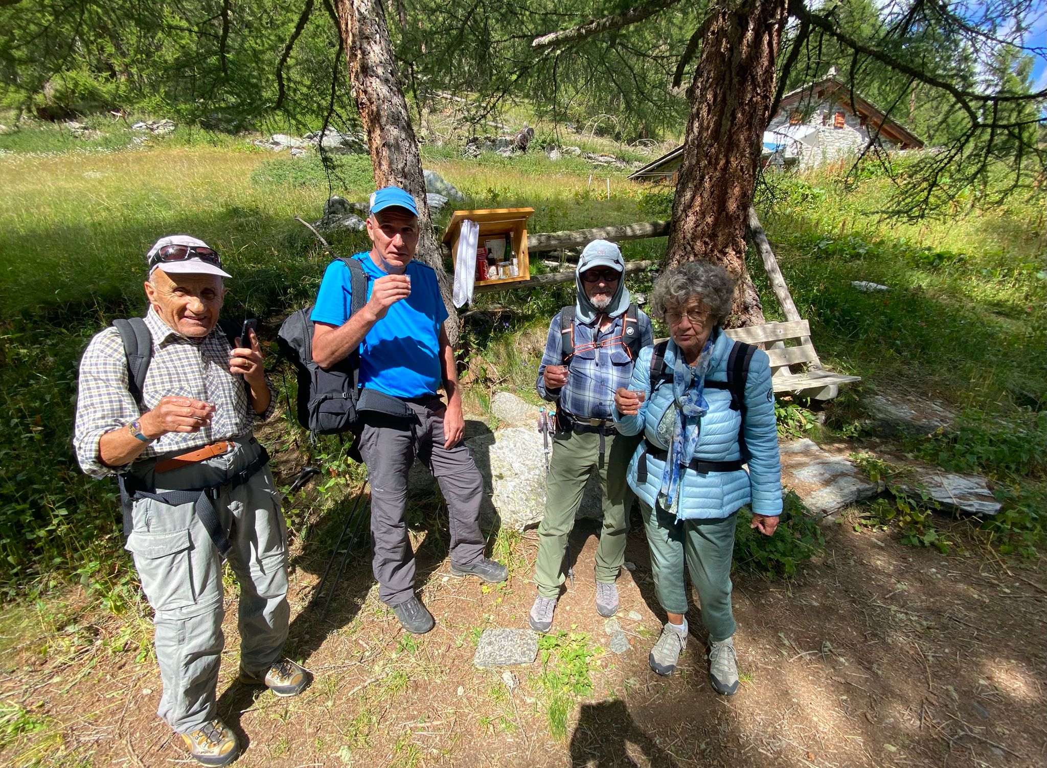 Bei den schwarzen Blatten angekommen trafen wir unsere Weggefährten und inzwischen bot sich uns auch ein wunderbares Bergpanorama hinter den nur noch vereinzelt hartnäckig verbliebenen Wolken. Gemütlichen Schrittes ging es weiter in Richtung Moosalp. Unterwegs gab es unverhofft noch einen kurzen Apero-Stopp. Das Bergrestaurant Moosalp hat Dienstag seinen Ruhetag. Ein Teilnehmer musste also auf sein heiss ersehntes Dessert verzichten und wir gönnten uns dafür im Dorbia eine Stärkung.