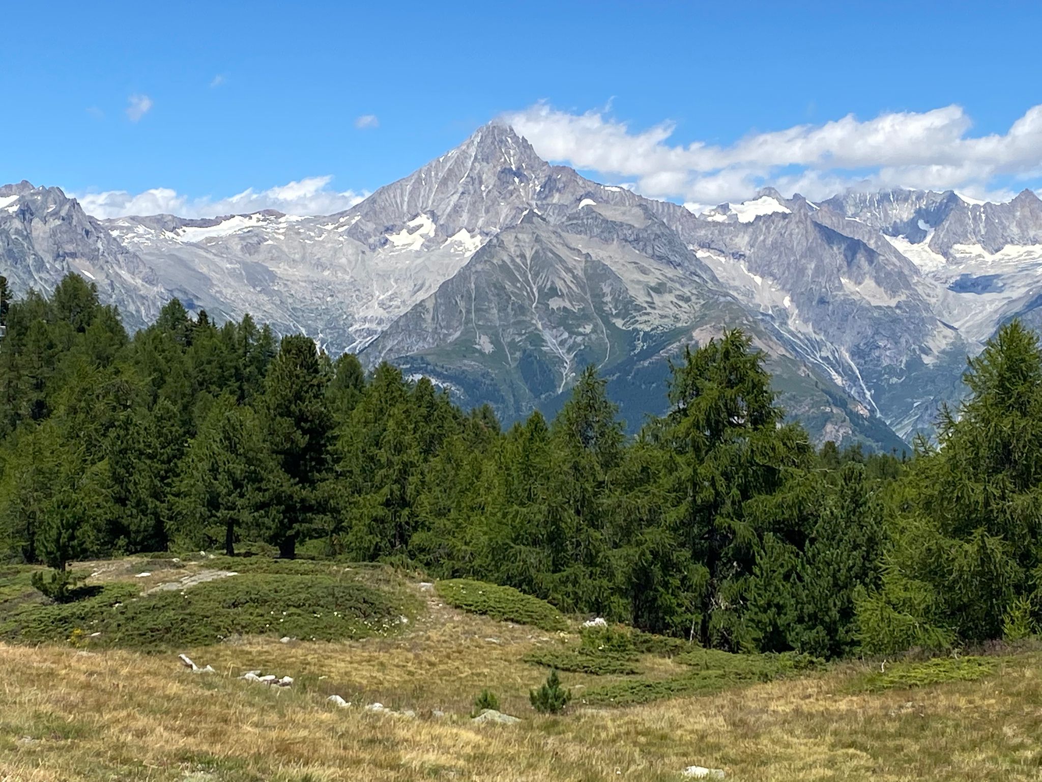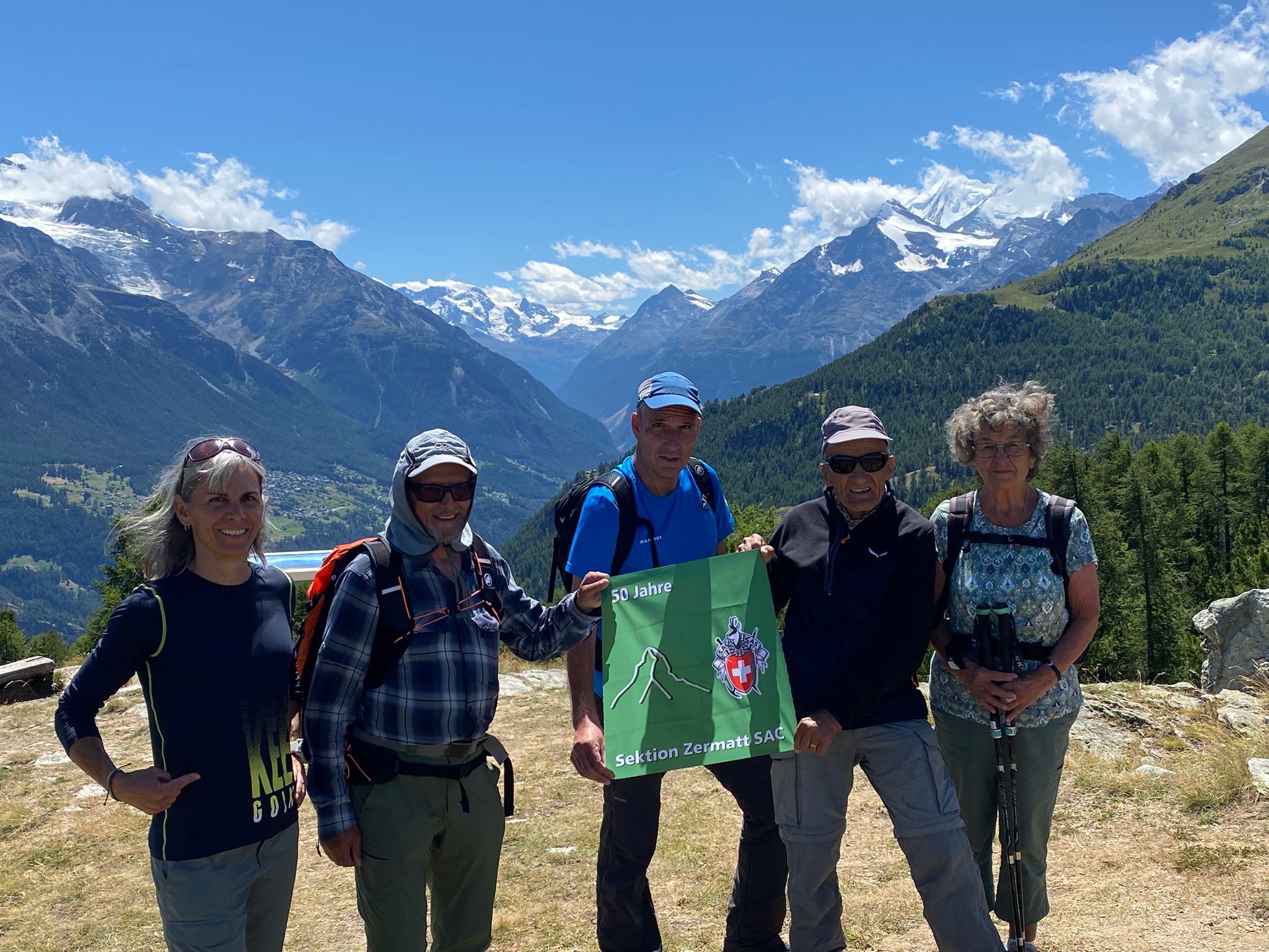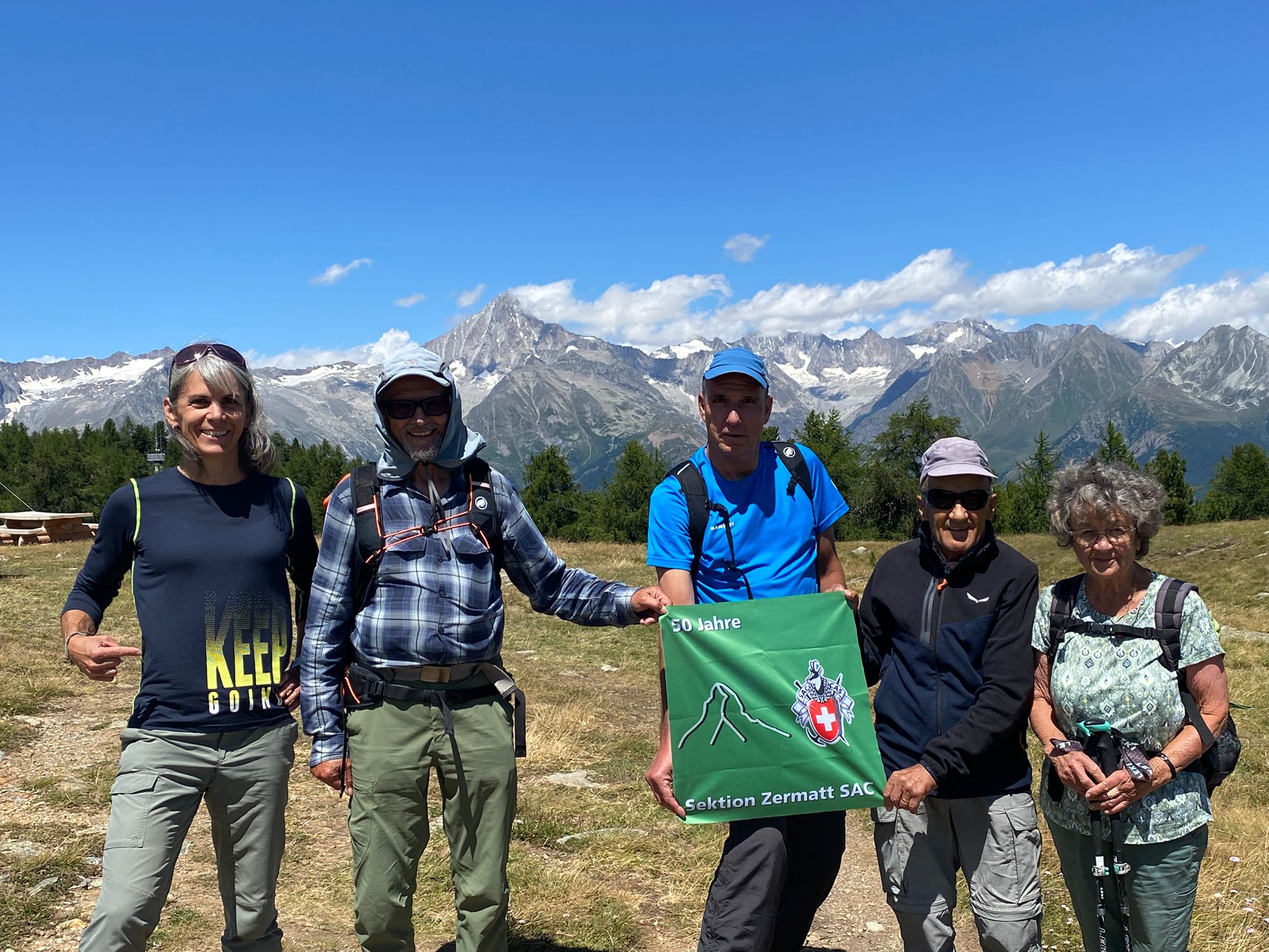 Bei den schwarzen Blatten angekommen trafen wir unsere Weggefährten und inzwischen bot sich uns auch ein wunderbares Bergpanorama hinter den nur noch vereinzelt hartnäckig verbliebenen Wolken. Gemütlichen Schrittes ging es weiter in Richtung Moosalp. Unterwegs gab es unverhofft noch einen kurzen Apero-Stopp. Das Bergrestaurant Moosalp hat Dienstag seinen Ruhetag. Ein Teilnehmer musste also auf sein heiss ersehntes Dessert verzichten und wir gönnten uns dafür im Dorbia eine Stärkung.