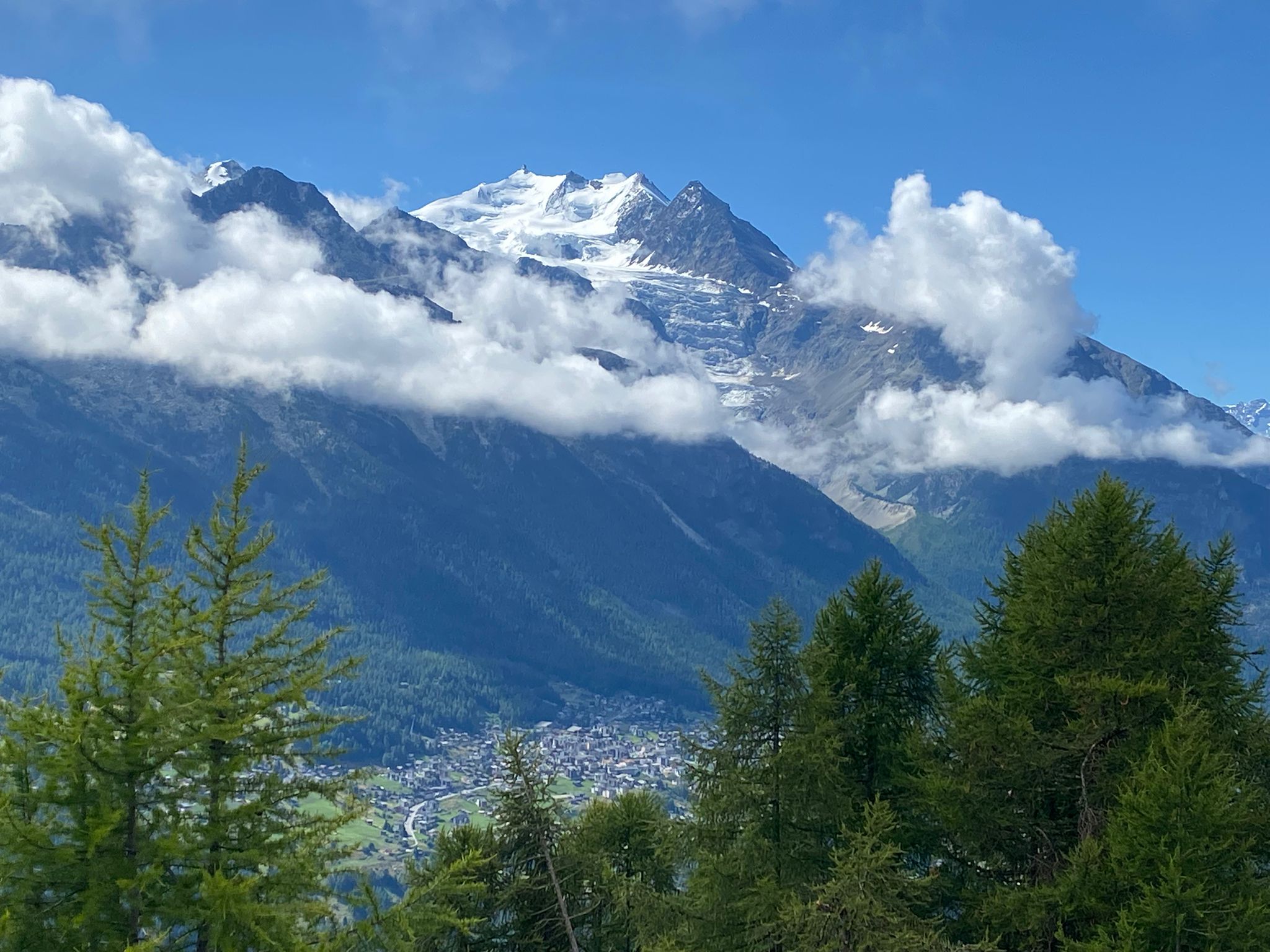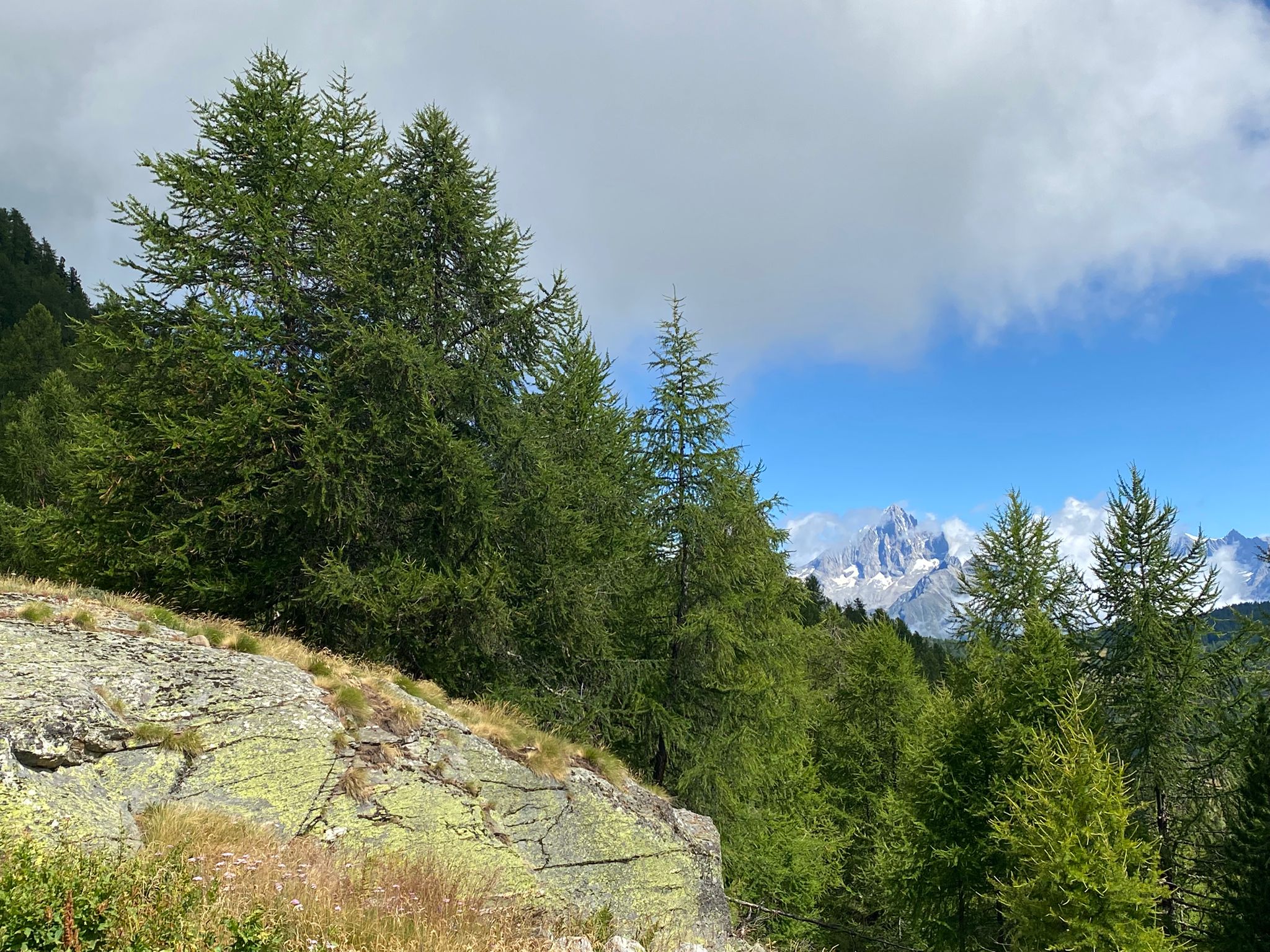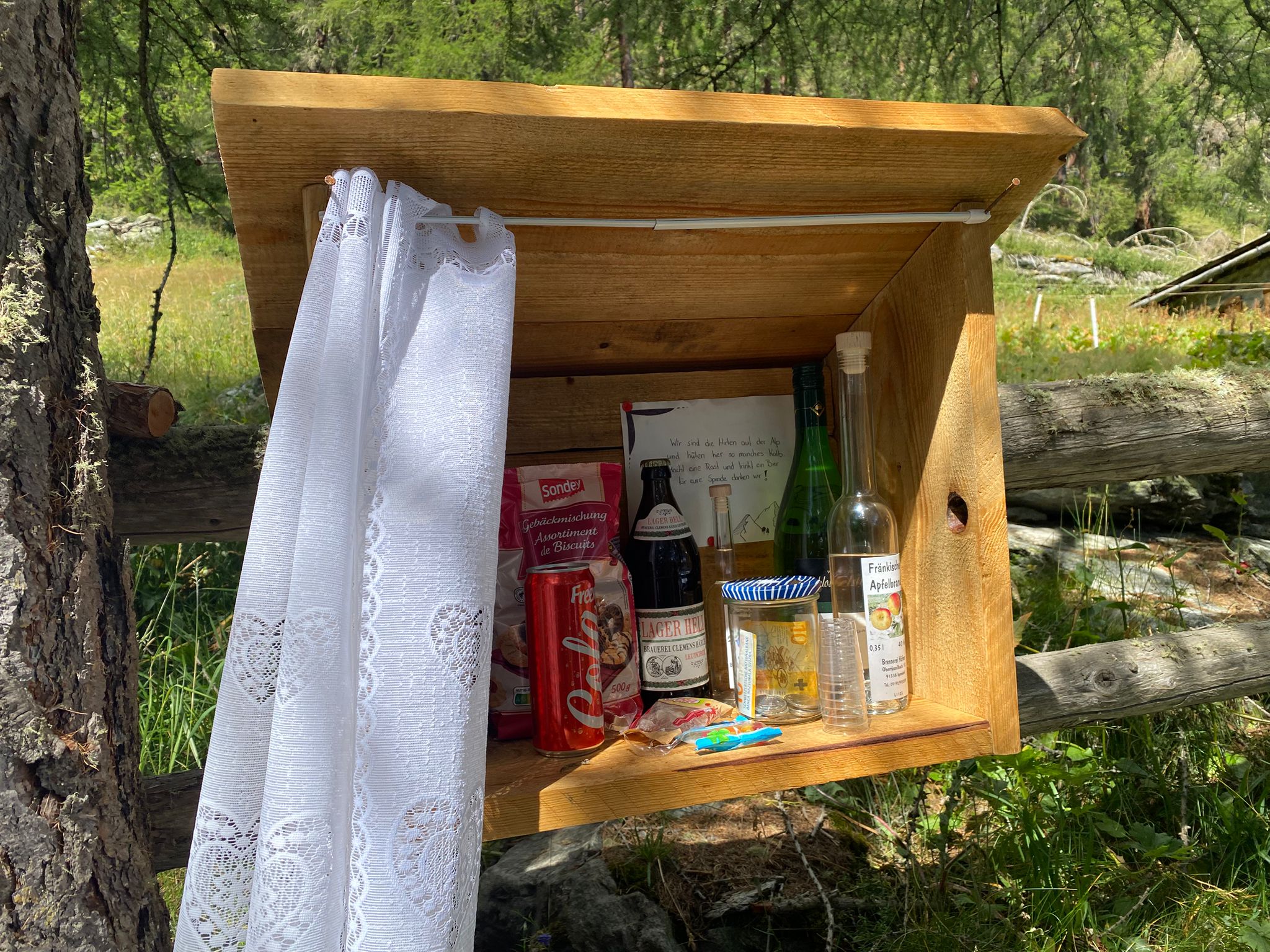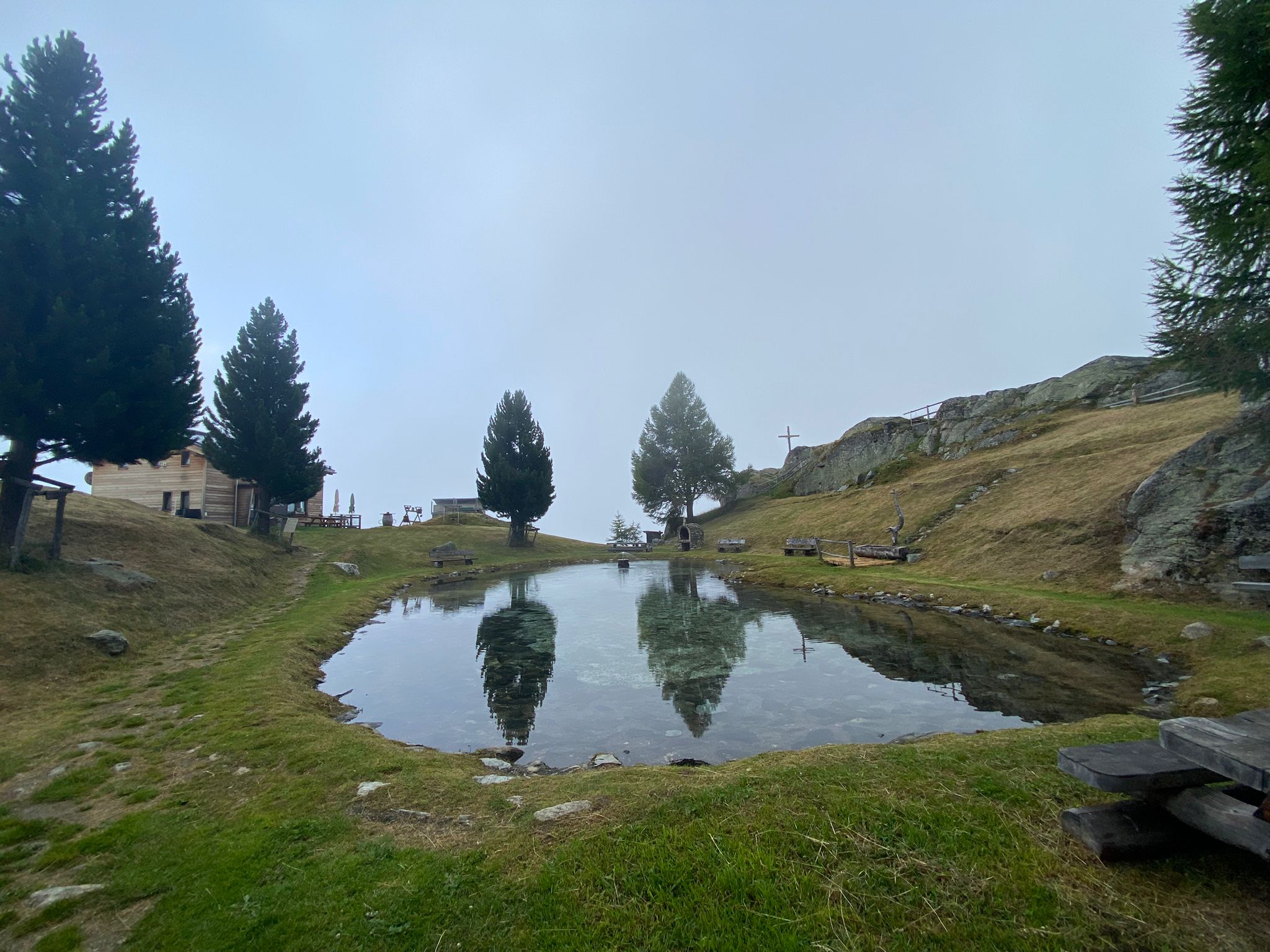 Bei den schwarzen Blatten angekommen trafen wir unsere Weggefährten und inzwischen bot sich uns auch ein wunderbares Bergpanorama hinter den nur noch vereinzelt hartnäckig verbliebenen Wolken. Gemütlichen Schrittes ging es weiter in Richtung Moosalp. Unterwegs gab es unverhofft noch einen kurzen Apero-Stopp. Das Bergrestaurant Moosalp hat Dienstag seinen Ruhetag. Ein Teilnehmer musste also auf sein heiss ersehntes Dessert verzichten und wir gönnten uns dafür im Dorbia eine Stärkung.