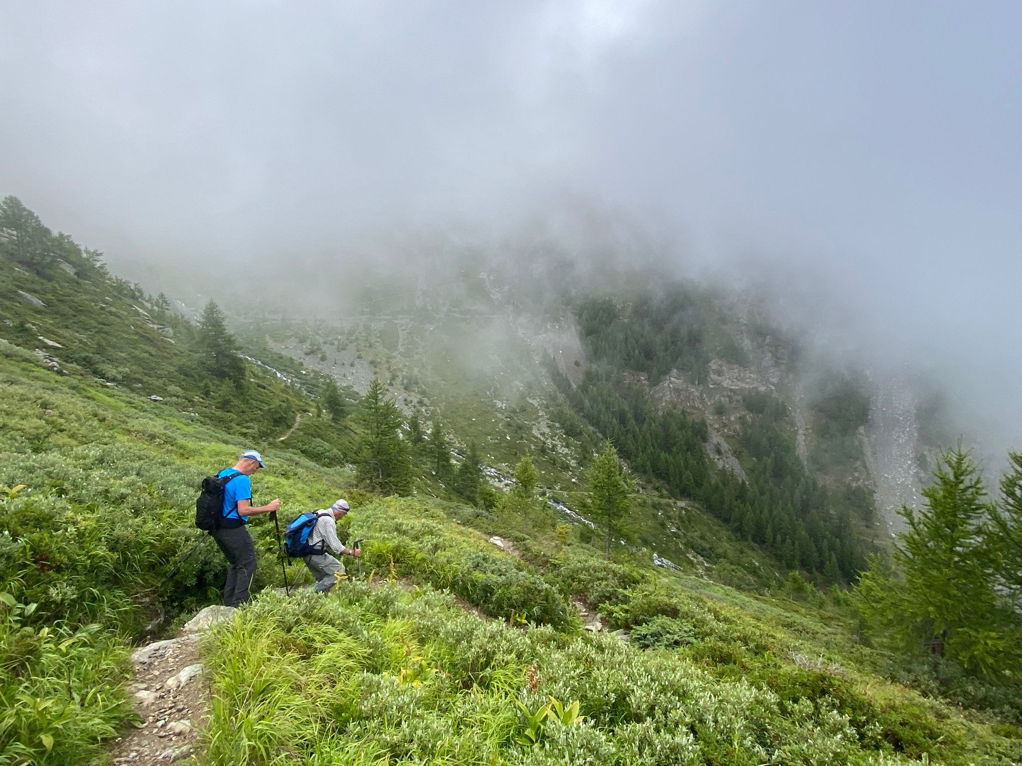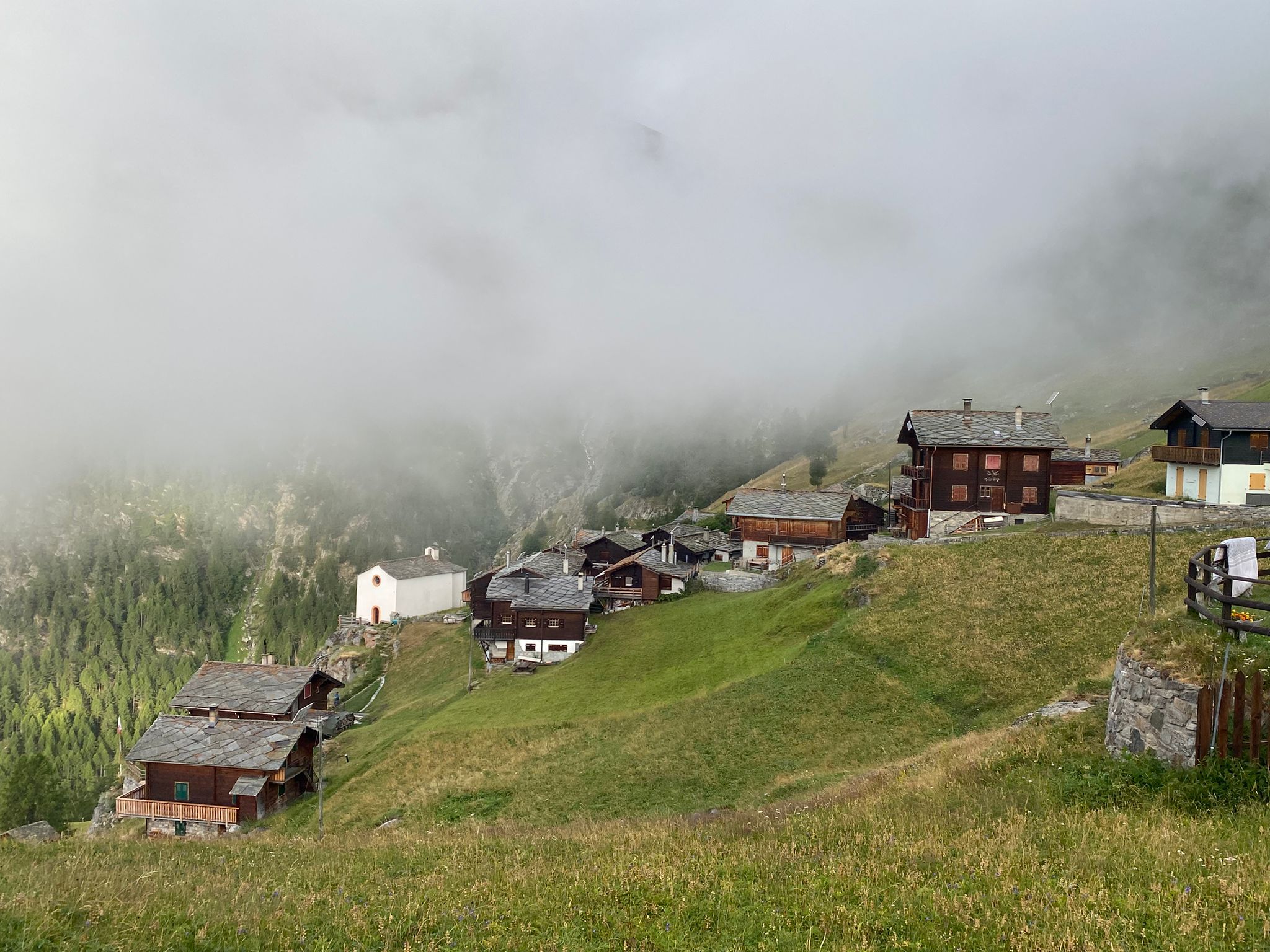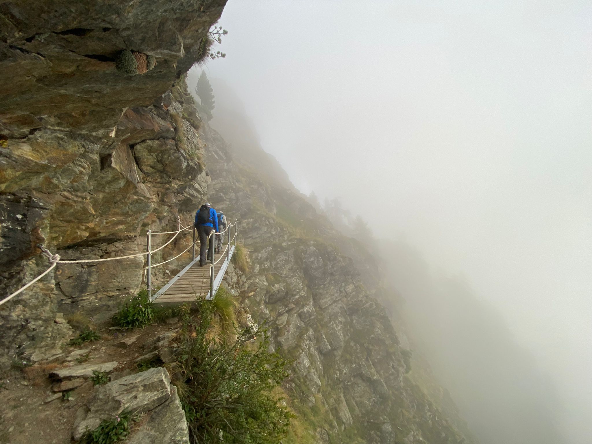 Um 07.45 trafen Luc und Karin am Bahnhof in St. Niklaus auf Sepp, unseren heutigen Wanderleiter. Zusammen fuhren wir mit dem Bähnli nach Jungu (1976 m). Der versprochene Kaffee musste allerdings noch warten, denn das Restaurant war zu so früher Stunde noch zu. Nebelschwaden gaben einmal den Blick auf Berg und Tal frei um sie im nächsten Moment wieder zu verschlingen. Dafür waren die Temperaturen recht angenehm zum Wandern.
