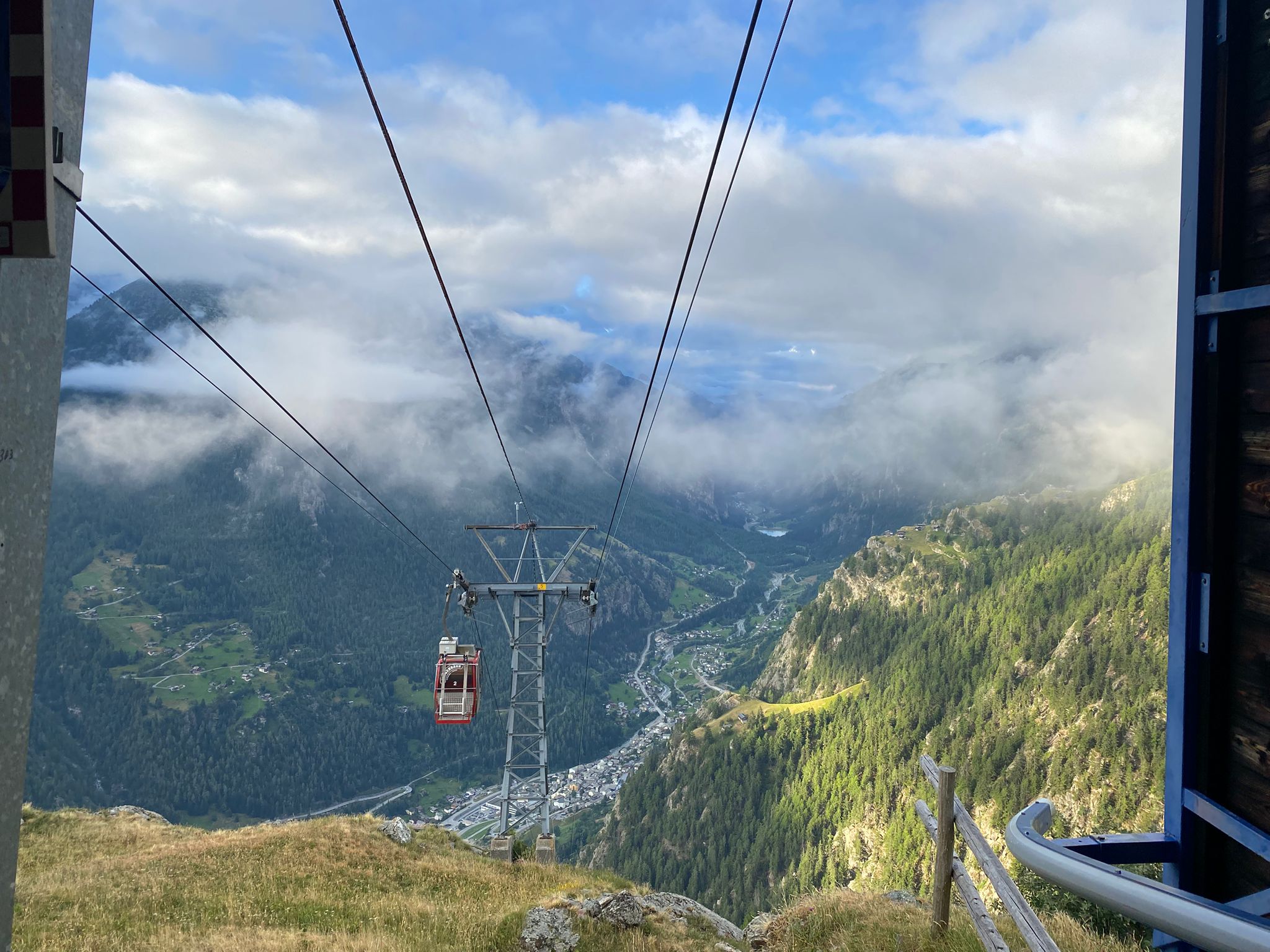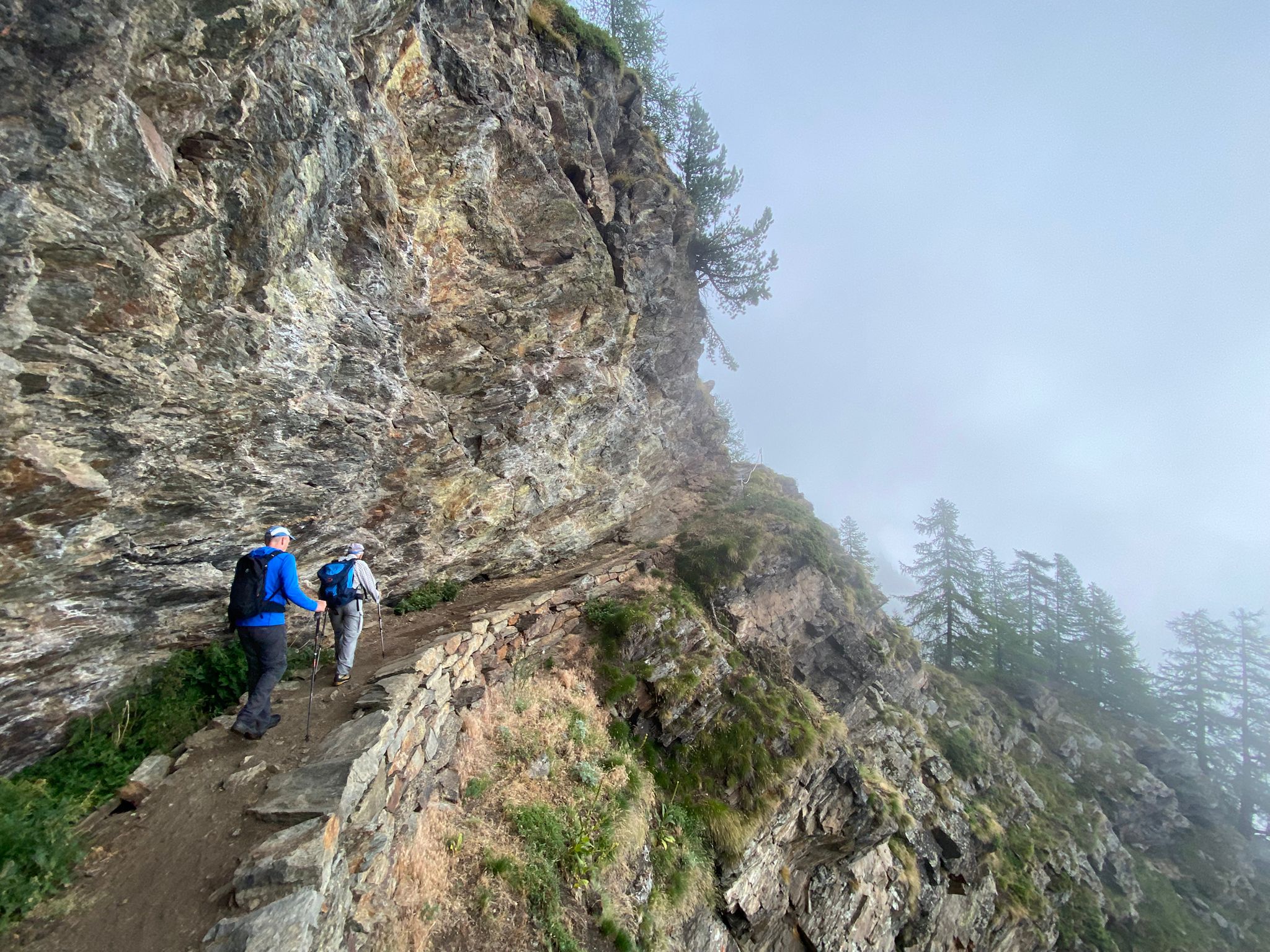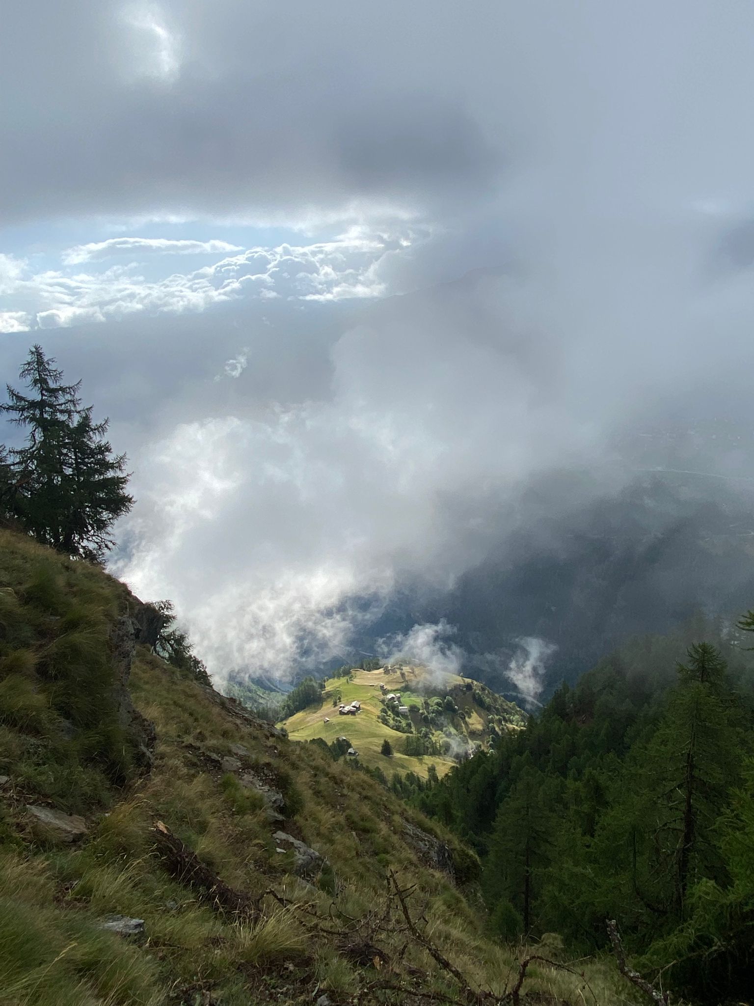 Um 07.45 trafen Luc und Karin am Bahnhof in St. Niklaus auf Sepp, unseren heutigen Wanderleiter. Zusammen fuhren wir mit dem Bähnli nach Jungu (1976 m). Der versprochene Kaffee musste allerdings noch warten, denn das Restaurant war zu so früher Stunde noch zu. Nebelschwaden gaben einmal den Blick auf Berg und Tal frei um sie im nächsten Moment wieder zu verschlingen. Dafür waren die Temperaturen recht angenehm zum Wandern.