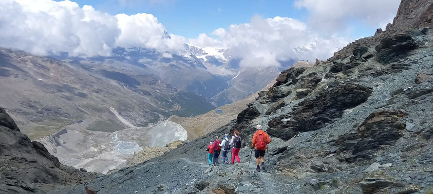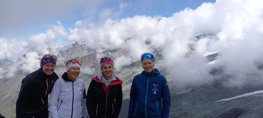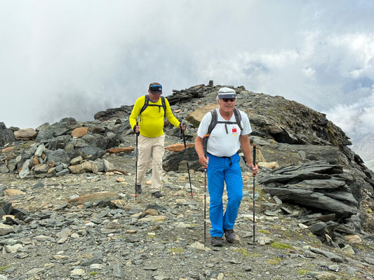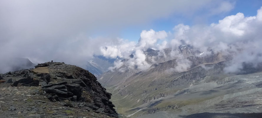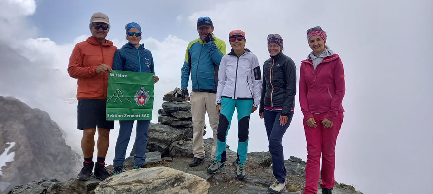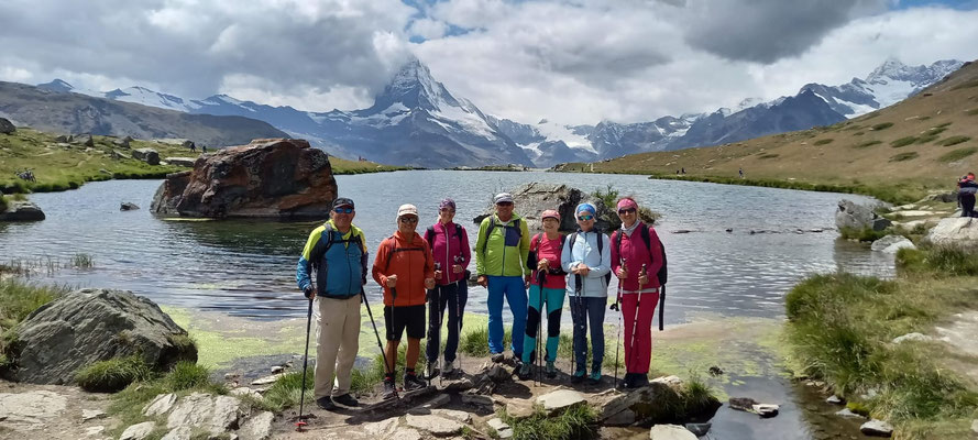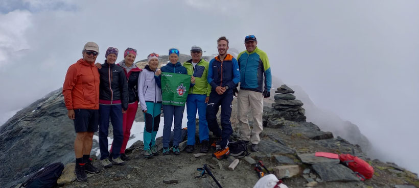 Nach kurzer Gipfelpause und einem wohlverdienten Genepy ging es auf gleichem Weg zurück – mit einem Einkehrschwung auf der Fluhalp. Am Stellisee riss die Wolkendecke auf, und das Matterhorn zeigte sich dann doch noch für ein tolles Schlussfoto.