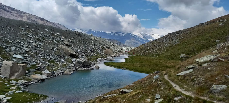 Wir starteten mit der ersten Bahn von Zermatt nach Blauherd. Der erste Abschnitt zum Stellisee war ein sanfter Einstieg. Der See lag still und das Matterhorn blieb vorerst von Wolken verborgen.